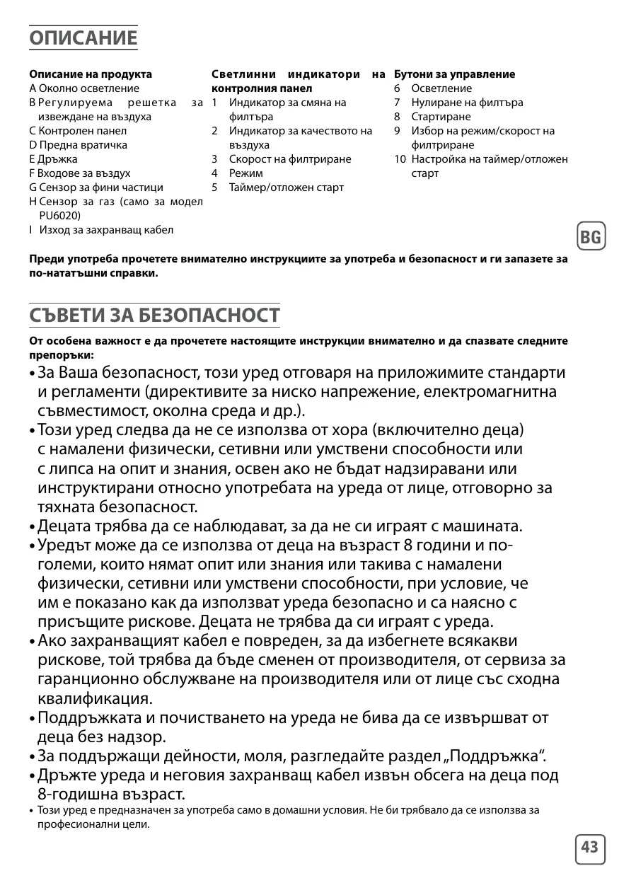 ОПИСАНИЕ Описание на продукта А Околно осветление B Р егулируема решетка за извеждане на въздуха C Контролен панел D Предна вратичка Е Дръжка F Входове за въздух G Сензор за фини частици H Сензор за газ (само за модел PU6020) I Изход за захранващ кабел