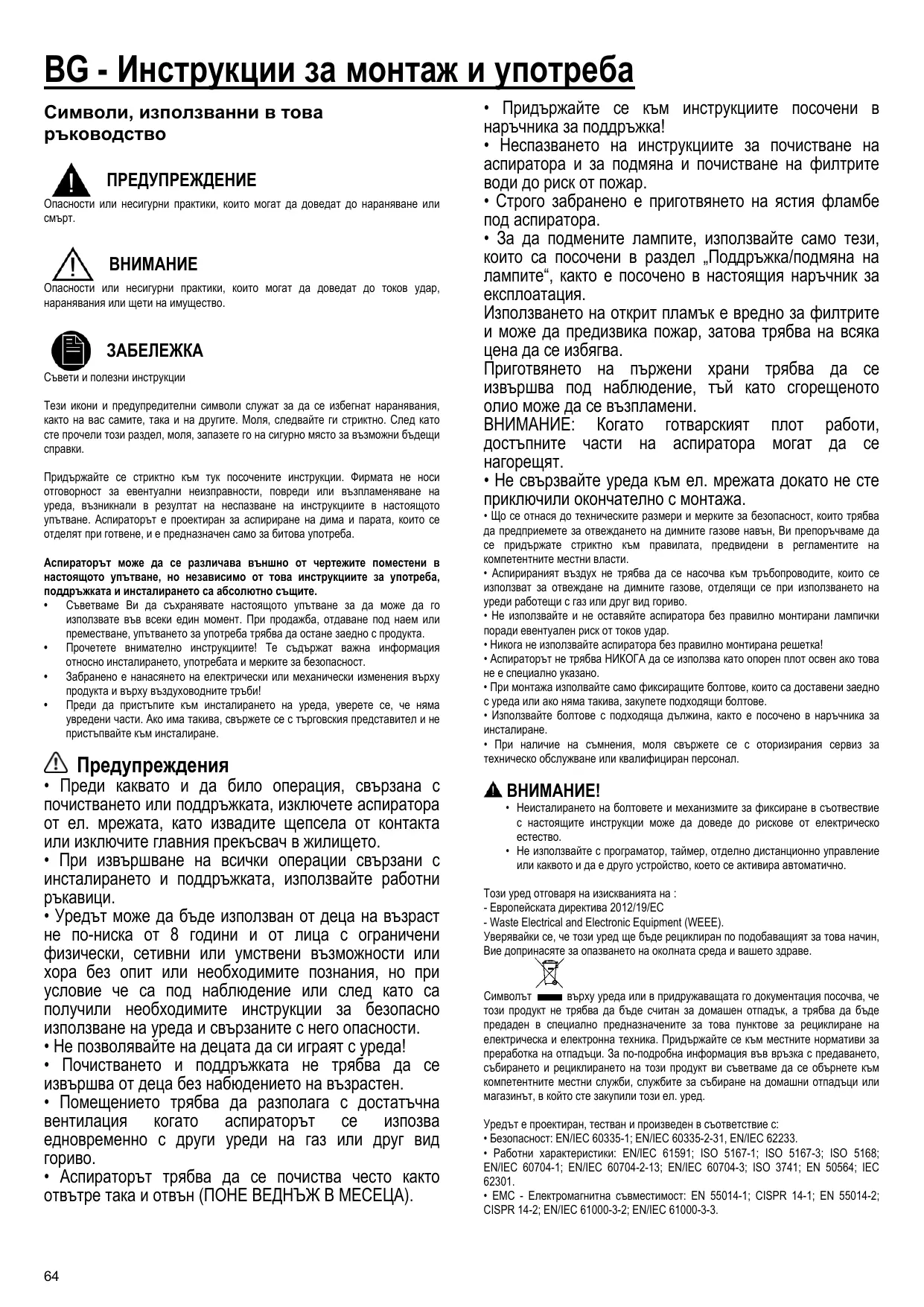 Съвети и полезни инструкции Тези икони и предупредителни символи служат за да се избегнат наранявания, както на вас самите, така и на другите. Моля, следвайте ги стриктно. След като сте прочели този раздел, моля, запазете го на сигурно място за възможни бъдещи Придържайте се стриктно към тук посочените инструкции. Фирмата не носи отговорност за евентуални неизправности, повреди или възпламеняване на уреда, възникнали в резултат на неспазване на инструкциите в настоящото упътване. Аспираторът е проектиран за аспириране на дима и парата, които се отделят при готвене, и е предназначен само за битова употреба. Аспираторът може да се различава външно от чертежите поместени в настоящото упътване, но независимо от това инструкциите за употреба, поддръжката и инсталирането са абсолютно същите.