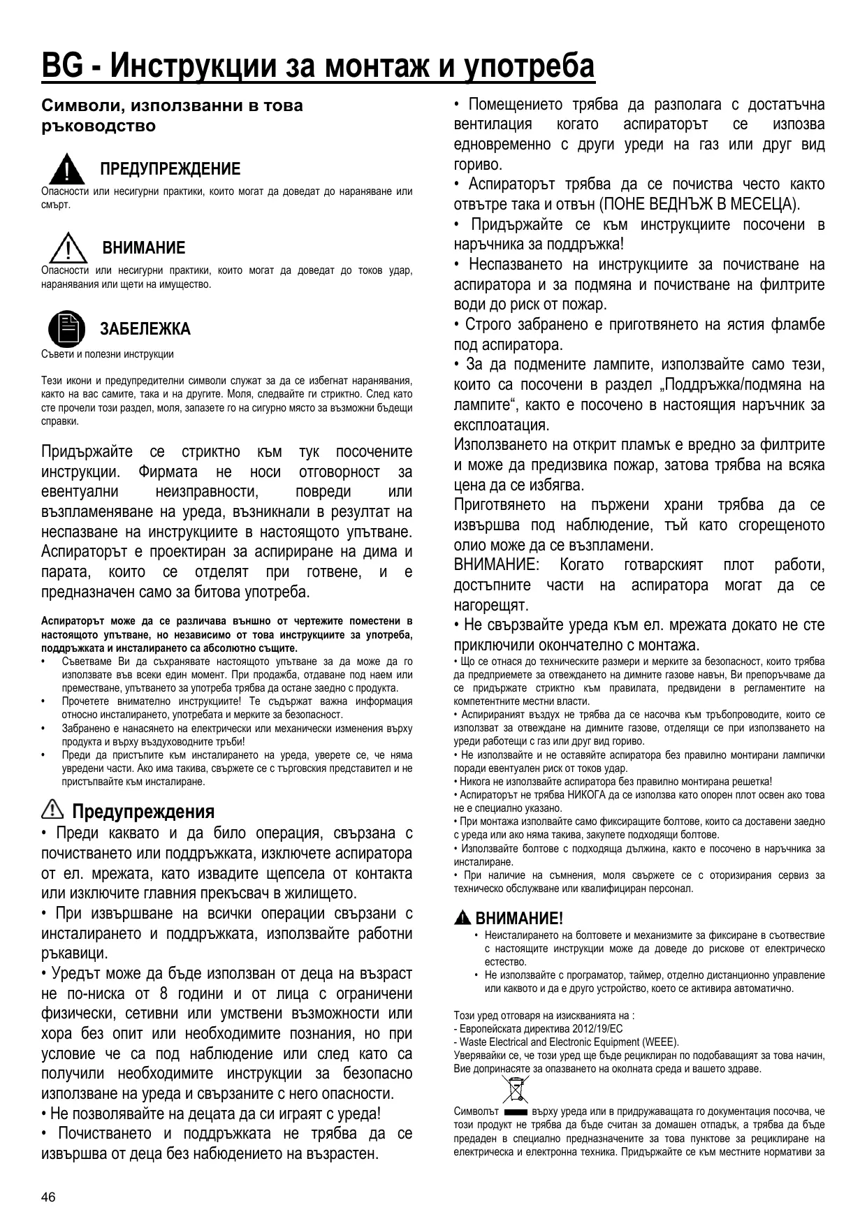 • Avant tout entretien ou nettoyage du produit débranchez l'alimentation électrique en retirant la fiche électrique ou en coupant l'interrupteur général. • Utilisez des gants de travail pour toute opération de nettoyage ou d'entretien. • Cet appareil peut être utilisé par des enfants âgés d’au moins 8 ans et par des personnes ayant des capacités physiques, sensorielles ou mentales réduites ou dénuées d’expériences ou de connaissances, sauf si ces personnes sont correctement surveillées ou si des instructions relatives à l'utilisation correcte de l'appareil permettant d'éviter tout danger leur ont été communiquées. • Les enfants ne doivent pas jouer avec l’appareil. • Le nettoyage et l’entretien par l’usager ne doivent pas être effectués par des enfants sans surveillance. • La pièce doit avoir une aération suffisante lorsque la hotte est utilisée conjointement avec d'autres appareils fonctionnant au gaz ou autres combustibles. • La hotte doit être régulièrement nettoyée à la fois à