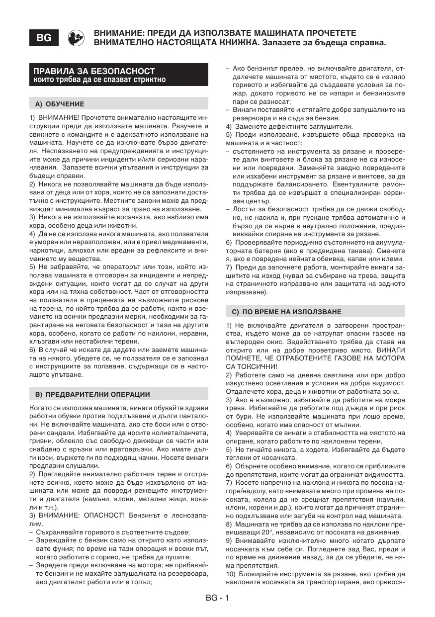 ВНИМАНИЕ: ПРЕДИ ДА ИЗПОЛЗВАТЕ МАШИНАТА ПРОЧЕТЕТЕ ВНИМАТЕЛНО НАСТОЯЩАТА КНИЖКА. Запазете за бъдеща справка. ПРАВИЛА ЗА БЕЗОПАСНОСТ които трябва да се спазват стриктно A) ОБУЧЕНИЕ