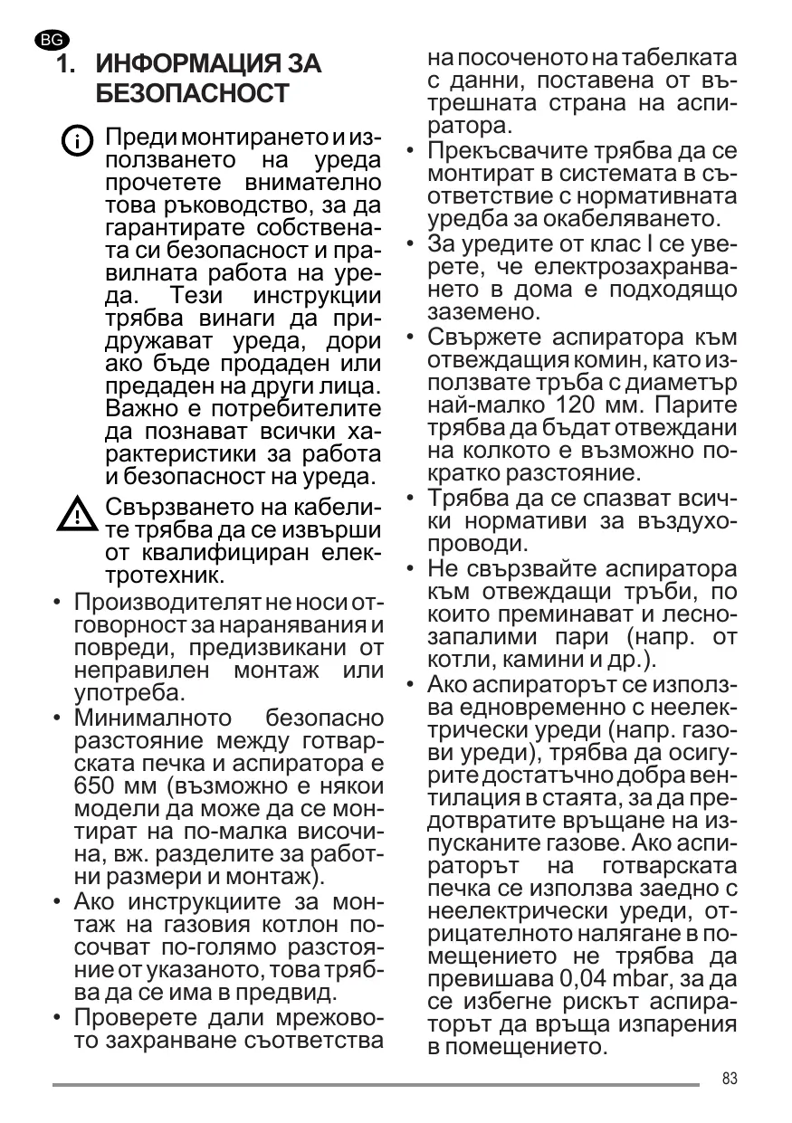 1. SICHERHEITSINFORMA TIONEN Lesen Sie bitte für Ihre eigene Sicherheit und die korrekte Funktion des Geräts diese Betriebsanleitung sorgfältig durch, bevor Sie es installieren und in Betrieb nehmen. Bewahren Sie die Betriebsanleitung stets zusammen mit dem Gerät auf, auch falls Sie dieses verkaufen oder Dritten überlassen. Es ist wichtig, dass die Benutzer mit allen Funktionsund Sicherheitsmerkmalen des Gerätes vertraut sind. Die Kabel müssen von kompetentem Fachpersonal angeschlossen werden. • En aucun cas le fabricant ne peut être tenu pour responsable de dommages éventuellement dus à une installation ou à une utilisation impropre. • La distance de sécurité minimum entre la table de cuisson et la hotte aspirante est de 650 mm (certains modèles peuvent être installés à une hauteur inférieure ; voir le paragraphe concernant les dimensions de travail et l’installation). • Si les instructions d’installation de la table de cuisson à gaz spécifient une distance supérieure à celle indiquée ci-