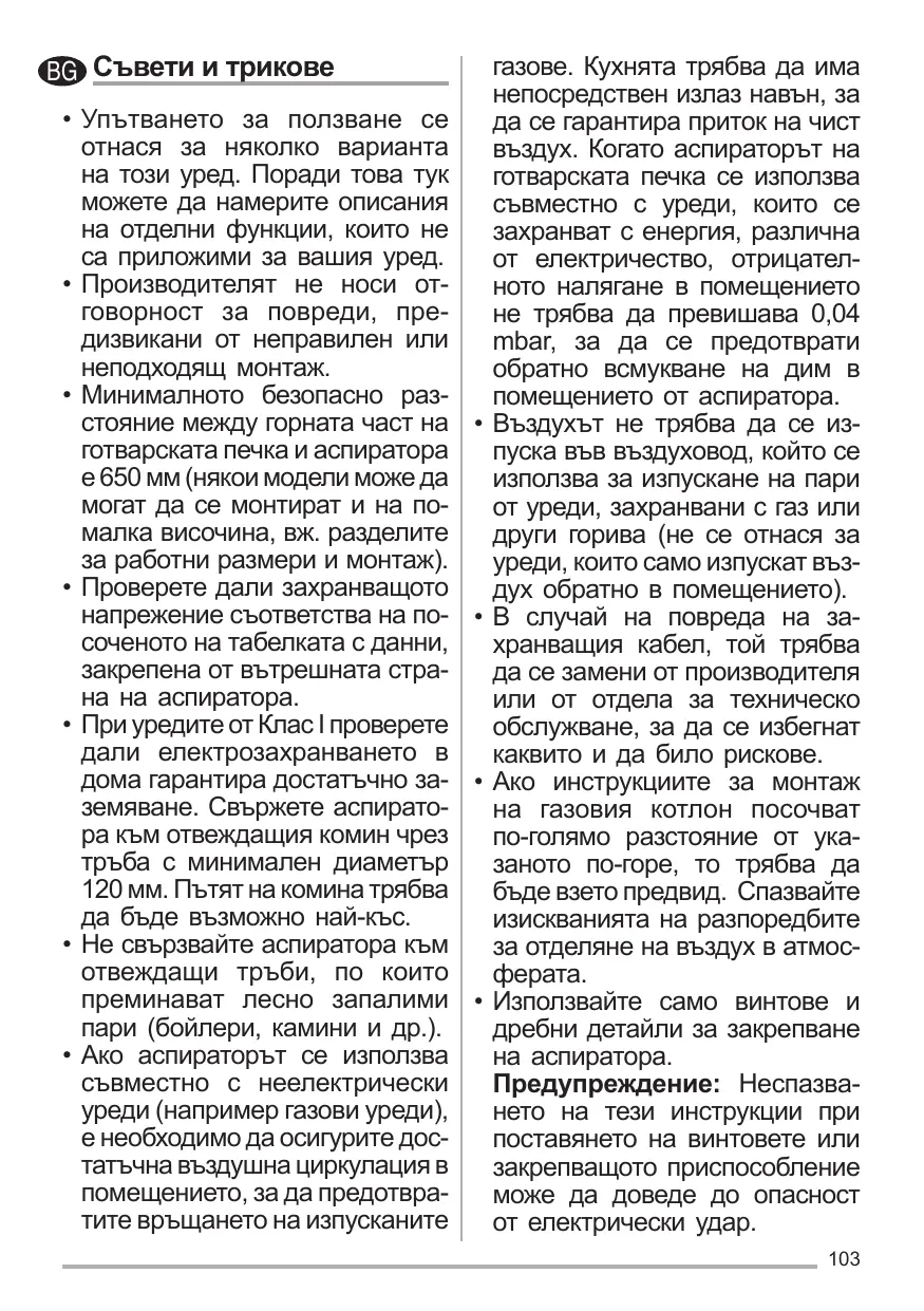 La trayectoria del humo debe ser lo más corta posible. • No conecte la campana extractora a los conductos de humo que transportan humo de combustión (ej. calderas, chimeneas, etc.). • Si la campana extractora se utiliza en combinación con aparatos no eléctricos (por ejemplo, aparatos de gas), debe garantizarse un grado suficiente de ventilación en