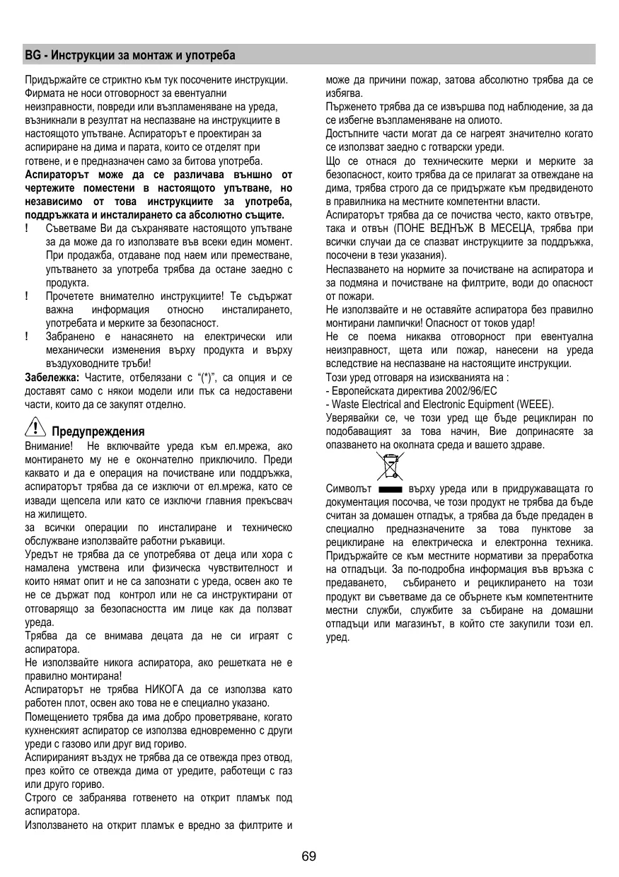 инсталирането, употребата и мерките за безопасност. Забранено е нанасянето на електрически или механически изменения върху продукта и върху въздуховодните тръби! Забележка: Частите, отбелязани с “(*)”, са опция и се доставят само с някои модели или пък са недоставени части, които да се закупят отделно. може да причини пожар, затова абсолютно трябва да се Пърженето трябва да се извършва под наблюдение, за да се избегне възпламеняване на олиото. Достъпните части могат да се нагреят значително когато се използват заедно с готварски уреди. Що се отнася до техническите мерки и мерките за безопасност, които трябва да се прилагат за отвеждане на дима, трябва строго да се придържате към предвиденото в правилника на местните компетентни власти. Аспираторът трябва да се почиства често, както отвътре, така и отвън (ПОНЕ ВЕДНЪЖ В МЕСЕЦА, трябва при всички случаи да се спазват инструкциите за поддръжка, посочени в тези указания). Неспазването на нормите за почистване на аспиратора и за подмяна и почистване на филтрите, води до опасност Не използвайте и не оставяйте аспиратора без правилно монтирани лампички! Опасност от токов удар! Не се поема никаква отговорност при евентуална неизправност, щета или пожар, нанесени на уреда вследствие на неспазване на настоящите инструкции. Този уред отговаря на изискванията на : - Европейската директива 2002/96/ЕС - Waste Electricаl and Electronic Equipment (WEEE). Уверявайки се, че този уред ще бъде рециклиран по подобаващият за това начин, Вие допринасяте за опазването на околната среда и вашето здраве. Предупреждения Внимание! Не включвайте уреда към ел.мрежа, ако монтирането му не е окончателно приключило. Преди каквато и да е операция на почистване или поддръжка, аспираторът трябва да се изключи от ел.мрежа, като се извади щепсела или като се изключи главния прекъсвач на жилището. за всички операции по инсталиране и техническо обслужване използвайте работни ръкавици. Уредът не трябва да се употребява от деца или хора с намалена умствена или физическа чувствителност и които нямат опит и не са запознати с уреда, освен ако те не се държат под контрол или не са инструктирани от отговарящо за безопасността им лице как да ползват Трябва да се внимава децата да не си играят с аспиратора. Не използвайте никога аспиратора, ако решетката не е правилно монтирана! Аспираторът не трябва НИКОГА да се използва като работен плот, освен ако това не е специално указано. Помещението трябва да има добро проветряване, когато кухненският аспиратор се използва едновременно с други уреди с газово или друг вид гориво. Аспирираният въздух не трябва да се отвежда през отвод, през който се отвежда дима от уредите, работещи с газ или друго гориво. Строго се забранява готвенето на открит пламък под аспиратора. Използването на открит пламък е вредно за филтрите и