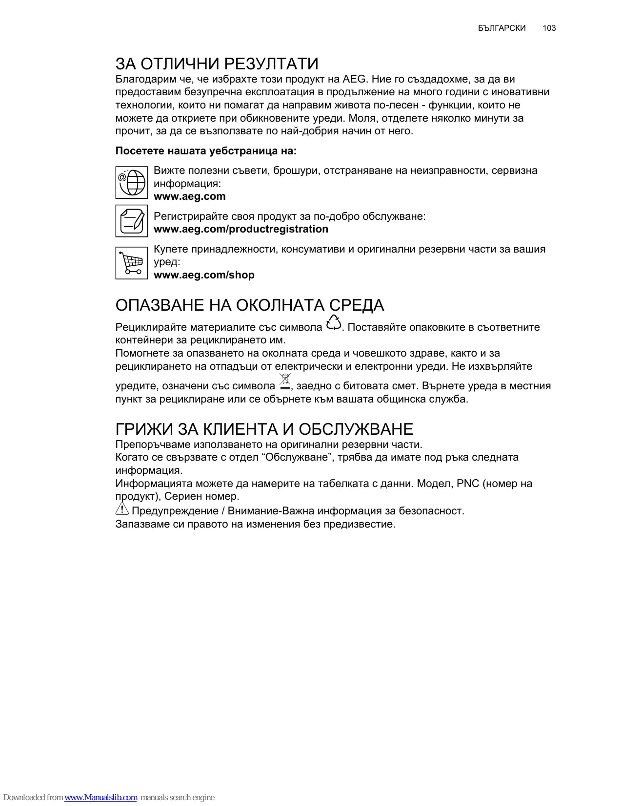 Благодарим че, че избрахте този продукт на AEG. Ние го създадохме, за да ви предоставим безупречна експлоатация в продължение на много години с иновативни технологии, които ни помагат да направим живота по-лесен - функции, които не можете да откриете при обикновените уреди. Моля, отделете няколко минути за прочит, за да се възползвате по най-добрия начин от него. Посетете нашата уебстраница на: Вижте полезни съвети, брошури, отстраняване на неизправности, сервизна информация: www.aeg.com Регистрирайте своя продукт за по-добро обслужване: www.aeg.com/productregistration Купете принадлежности, консумативи и оригинални резервни части за вашия уред: www.aeg.com/shop