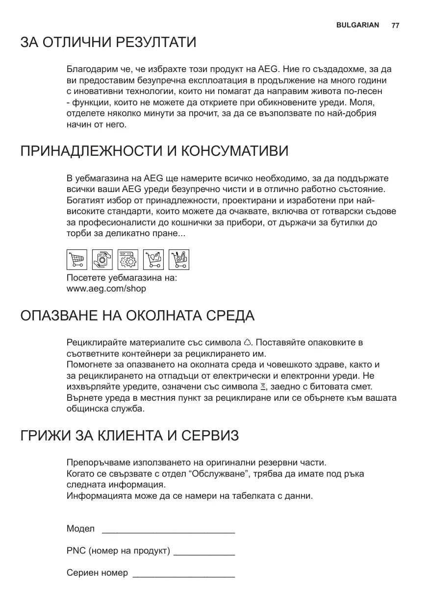 ЗА ОТЛИЧНИ РЕЗУЛТАТИ Благодарим че, че избрахте този продукт на AEG. Ние го създадохме, за да ви предоставим безупречна експлоатация в продължение на много години с иновативни технологии, които ни помагат да направим живота по-лесен - функции, които не можете да откриете при обикновените уреди. Моля, отделете няколко минути за прочит, за да се възползвате по най-добрия начин от него. ПРИНАДЛЕЖНОСТИ И КОНСУМАТИВИ В уебмагазина на AEG ще намерите всичко необходимо, за да поддържате всички ваши AEG уреди безупречно чисти и в отлично работно състояние. Богатият избор от принадлежности, проектирани и изработени при найвисоките стандарти, които можете да очаквате, включва от готварски съдове за професионалисти до кошнички за прибори, от държачи за бутилки до торби за деликатно пране... Посетете уебмагазина на: www.aeg.com/shop ОПАЗВАНЕ НА ОКОЛНАТА СРЕДА Рециклирайте материалите със символа . Поставяйте опаковките в съответните контейнери за рециклирането им. Помогнете за опазването на околната среда и човешкото здраве, както и за рециклирането на отпадъци от електрически и електронни уреди. Не изхвърляйте уредите, означени със символа , заедно с битовата смет. Върнете уреда в местния пункт за рециклиране или се обърнете към вашата общинска служба. ГРИЖИ ЗА КЛИЕНТА И СЕРВИЗ Препоръчваме използването на оригинални резервни части. Когато се свързвате с отдел “Обслужване”, трябва да имате под ръка следната информация. Информацията може да се намери на табелката с данни. Модел ___________________________ PNC (номер на продукт) _____________ Сериен номер _____________________ 78 www.aeg.com