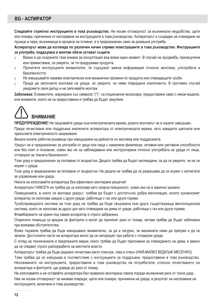 Avant toute opération de nettoyage ou d'entretien, mettez la hotte hors tension en débranchant la prise secteur ou, en cas de raccordement permanent, en désarmant le disjoncteur. Mettez des gants de protection avant d'effectuer toute opération d'installation et d'entretien. Cet appareil n'est pas prévu pour les enfants ou les personnes à capacités physiques, sensorielles ou mentales réduites ou manquant d'expérience et de connaissances. Elles ne pourront l'utiliser que sous la surveillance d'un adulte responsable de leur sécurité et après avoir été mises au courant de son fonctionnement. La hotte est prévue pour des adultes. Surveillez les enfants afin qu'ils ne jouent pas avec l'appareil ou avec ses commandes. Ne mettez jamais la hotte en marche si la grille n'est pas bien en place. Ne déposez AUCUN objet sur la hotte sauf si cela est expressément autorisé. Quand la hotte fonctionne en même temps que d'autres appareils à gaz ou autres combustibles, la cuisine doit disposer d'une ventilation suffisante. L'air aspiré par la hotte ne doit jamais être expulsé dans le conduit d'évacuation des fumées de combustion dégagées par des appareils fonctionnant au gaz ou autres combustibles. Il est formellement interdit de flamber les aliments sous la hotte. Évitez de laisser brûler une flamme nue sous la hotte, car cela peut endommager les filtres et provoquer un incendie. Surveillez vos fritures en permanence, car la graisse ou l'huile surchauffée peut prendre feu. Les parties accessibles de la hotte peuvent devenir assez chaudes quand les appareils de cuisson sont en marche. En ce qui concerne les mesures techniques de sécurité pour l'évacuation des fumées, respectez strictement les réglementations et normes en vigueur dans votre pays. La hotte doit être régulièrement nettoyée, aussi bien à l'intérieur qu'à l'extérieur (AU MOINS UNE FOIS PAR MOIS), et ceci en respectant les instructions d'entretien fournies dans ce manuel. Le non-respect des consignes concernant le nettoyage de la hotte ainsi que le remplacement et le nettoyage des filtres peut entraîner un risque d'incendie. Afin d'éviter tout risque de choc électrique, n'utilisez pas la hotte si les lampes ne sont pas bien en place. Nous déclinons toute responsabilité pour tout dysfonctionnement, dommage ou incendie résultant du non-respect des consignes figurant dans cette notice.