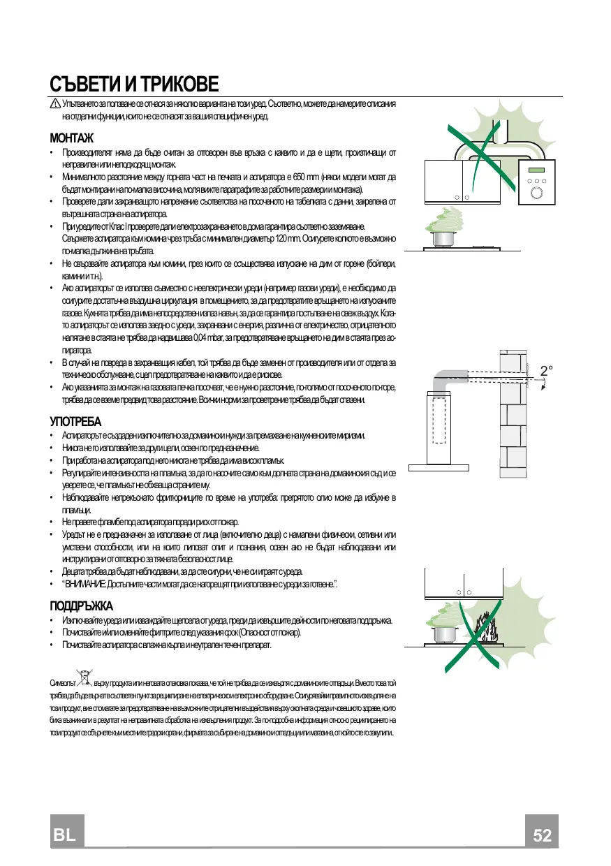 Аспираторътесъздаденизключителнозадомакински нуждизапремахваненакухненскитемиризми. Никоганегоизползвайтезадругицели,освенпо предназначение. Приработанааспиратораподнегоникоганетрябвадаимависокпламък. Регулирайте интензивността на пламъка, за да го насочите само към долната страна на домакинския съд и се уверетесе,чепламъкътнеобхващастранитему. Наблюдавайте непрекъснато фритюрниците по време на употреба: прегрятото олио може да избухне в пламъци. Неправетефламбеподаспираторапоради риск отпожар. Уредът не е предназначен за използване от лица (включително деца) с намалени физически, сетивни или умствени способности, или на които липсват опит и познания, освен ако не бъдат наблюдавани или инструктирани ототговорнозатяхнатабезопасностлице. Децататрябвадабъдатнаблюдавани,зада стесигурни,ченесииграятсуреда. “ВНИМАНИЕ:Достъпнитечасти могатдасенагорещятприизползванесуредизаготвене.”.