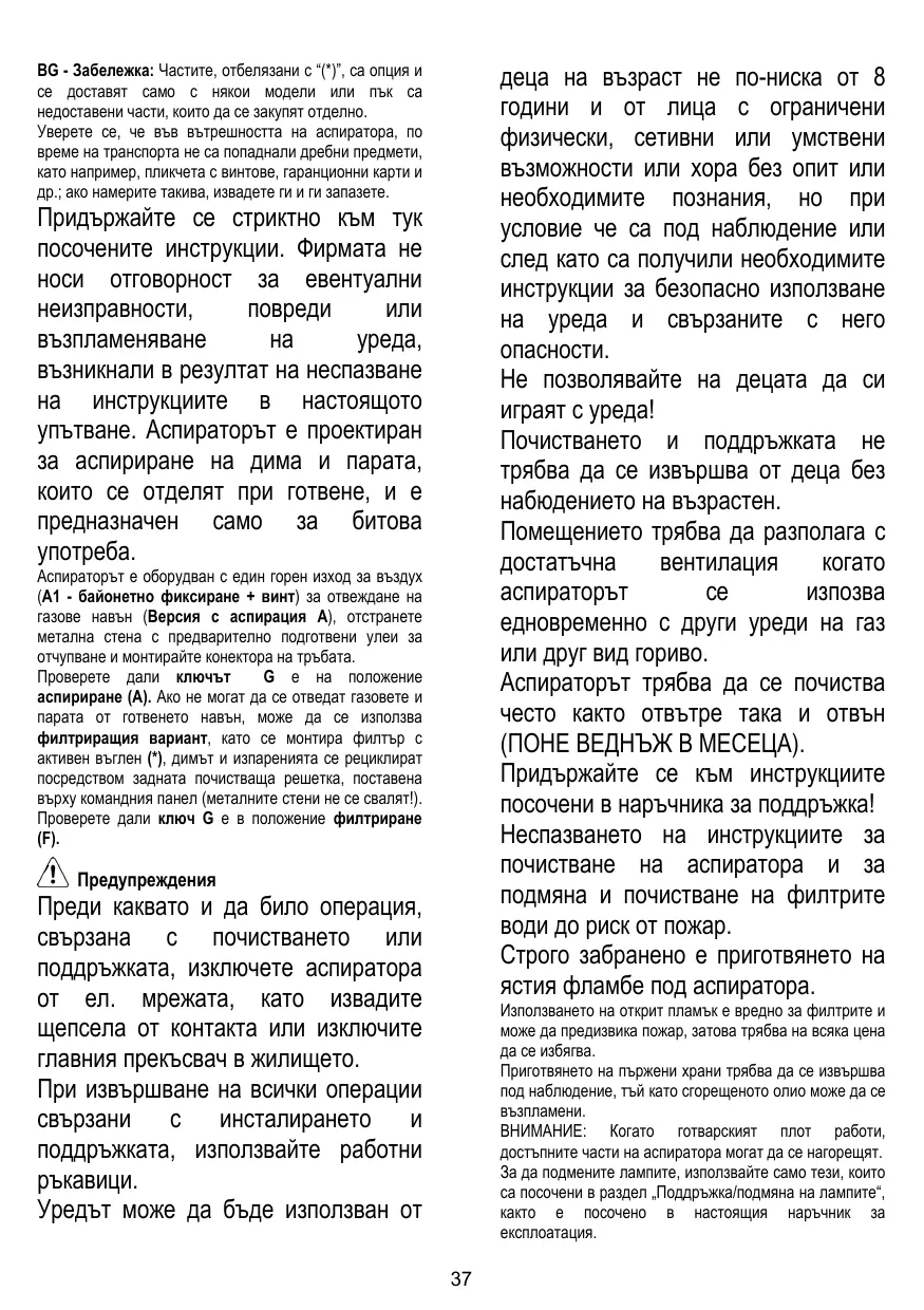La limpieza y el mantenimiento no deben ser realizados por niños sin debida supervisión. La habitación debe estar suficientemente ventilada cuando la campana se utiliza contemporáneamente con otros dispositivos a combustión de gas u otros combustibles. La campana debe ser limpiada con frecuencia, tanto internamente como externamente (POR LO MENOS UNA VEZ AL MES), en todo caso seguir lo que se indica expresamente en las instrucciones de mantenimiento. La inobservancia de las normas de limpieza de la campana y del cambio y la limpieza puede comportar riesgo de incendios. Es estrictamente prohibido flamear los alimentos bajo la campana.