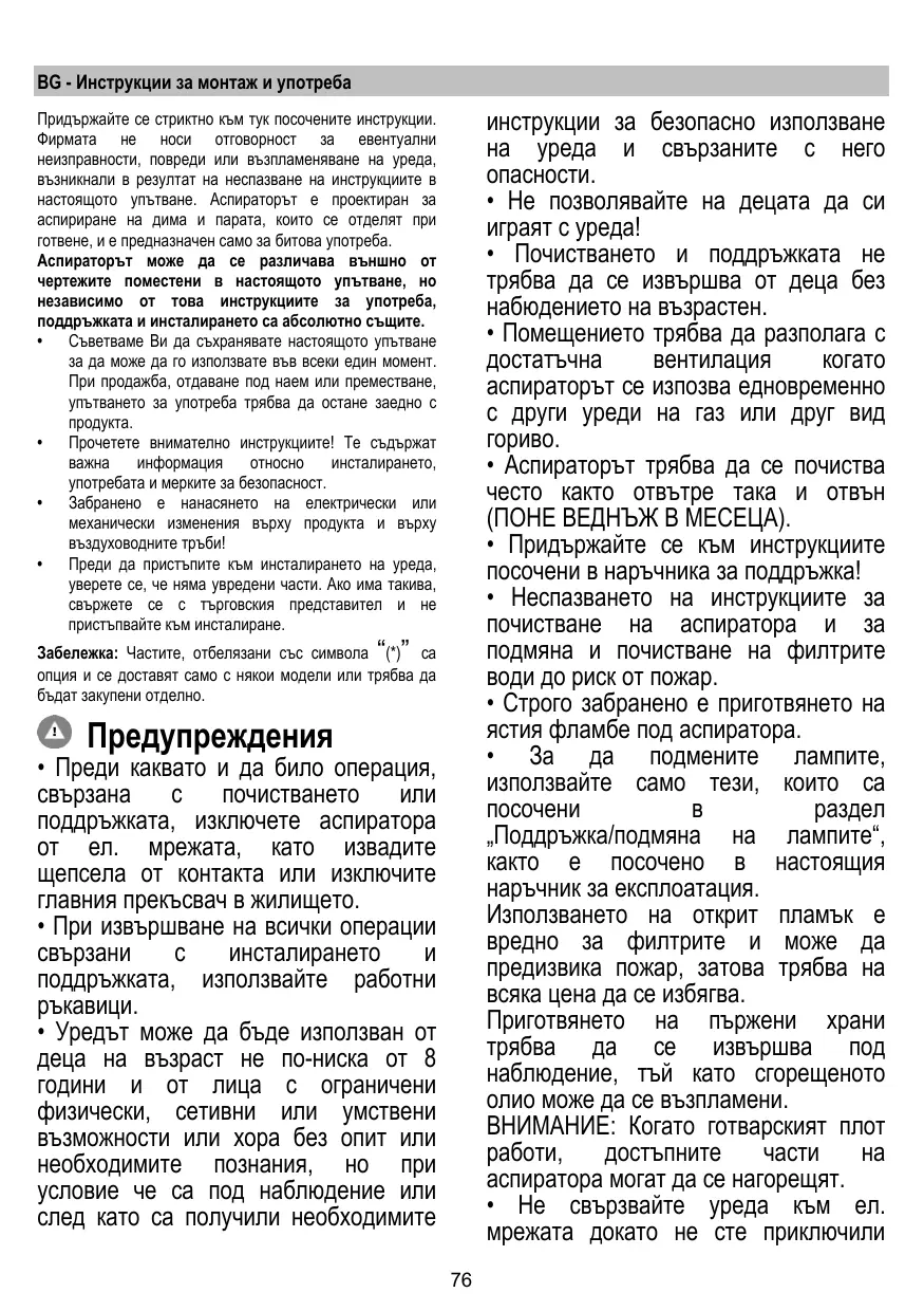 • Преди каквато и да било операция, свързана с почистването или поддръжката, изключете аспиратора от ел. мрежата, като извадите щепсела от контакта или изключите главния прекъсвач в жилището. • При извършване на всички операции свързани с инсталирането и поддръжката, използвайте работни ръкавици. • Уредът може да бъде използван от деца на възраст не по-ниска от 8 години и от лица с ограничени физически, сетивни или умствени възможности или хора без опит или необходимите познания, но при условие че са под наблюдение или след като са получили необходимите 76