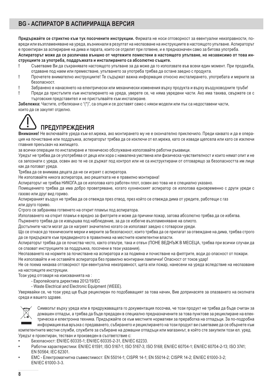 Les enfants doivent être surveillés afin qu’ils ne jouent pas avec l’appareil. Ne jamais utiliser la hotte sans que la grille ne soit montée correctement! La hotte ne doit JAMAIS être utilisée comme plan pour déposer quelque chose sauf si cela est expressément indiqué. Quand la hotte est utilisée en même temps que d’autres appareils à combustion de gaz ou d’autres combustibles, le local doit disposer d’une ventilation suffisante. L’air aspiré ne doit jamais être envoyé dans un conduit utilisé pour l’évacuation des fumées produites par des appareils à combustion de gaz ou d’autres combustibles. Il est formellement interdit de faire flamber les aliments sous la hotte. L’utilisation de flammes libres peut entraîner des dégâts aux filtres et peut donner lieu à des incendies, il faut donc les éviter à tout prix. La friture d’aliments doit être réalisée sous contrôle pour éviter que l’huile surchauffée ne prenne feu. Les pièces accessibles peuvent se réchauffer de façon importante quand elles sont utilisées avec des appareils pour la cuisson. En ce qui concerne les mesures techniques et de sécurité à adopter pour l’évacuation des fumées, s’en tenir strictement à ce qui est prévu dans les règlements des autorités locales compétentes. La hotte doit être régulièrement nettoyée, aussi bien à l’intérieur qu’à l’extérieur (AU MOINS UNE FOIS PAR MOIS, respecter néanmoins les instructions relatives à l’entretien fournies dans ce manuel). La non observation de ces normes de nettoyage de la hotte et du changement et nettoyage des filtres comporte des risques d’incendie. Ne pas utiliser ou laisser la hotte sans que les ampoules soient correctement placées pour éviter tout risque de choc électrique. La société décline toute responsabilité pour d’éventuels inconvénients, dégâts ou incendies provoqués par l’appareil et dérivés de la non observation des instructions reprises dans ce manuel. Cet appareil porte le symbole du recyclage conformément à la Directive Européenne 2012/19/CE concernant les Déchets d’Équipements Électriques et Électroniques (DEEE ou WEEE). En procédant correctement à la mise au rebut de cet appareil, vous contribuerez à empêcher toute conséquence nuisible pour l’environnement et la santé de l’homme. Le symbole présent sur l’appareil ou sur la documentation qui l’accompagne indique que ce produit ne peut en aucun cas être traité comme déchet ménager. Il doit par conséquent être remis à un centre de collecte des déchets chargé du recyclage des équipements électriques et électroniques. Pour la mise au rebut, respectez les normes relatives à l’élimination des déchets en vigueur dans le pays d’installation. Pour obtenir de plus amples détails au sujet du traitement, de la récupération et du recyclage de cet appareil, veuillez vous adresser au bureau compétent de votre commune, à la société de collecte des déchets ou directement à votre revendeur.