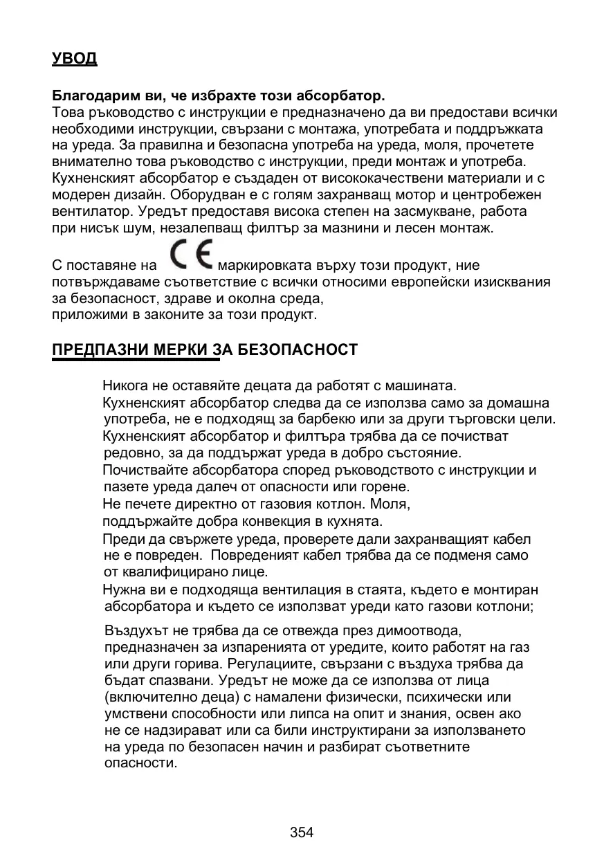 УВОД Благодарим ви, че избрахте този абсорбатор. Това ръководство с инструкции е предназначено да ви предостави всички необходими инструкции, свързани с монтажа, употребата и поддръжката на уреда. За правилна и безопасна употреба на уреда, моля, прочетете внимателно това ръководство с инструкции, преди монтаж и употреба. Кухненският абсорбатор е създаден от висококачествени материали и с модерен дизайн. Оборудван е с голям захранващ мотор и центробежен вентилатор. Уредът предоставя висока степен на засмукване, работа при нисък шум, незалепващ филтър за мазнини и лесен монтаж. С поставяне на маркировката върху този продукт, ние потвърждаваме съответствие с всички относими европейски изисквания за безопасност, здраве и околна среда, приложими в законите за този продукт.