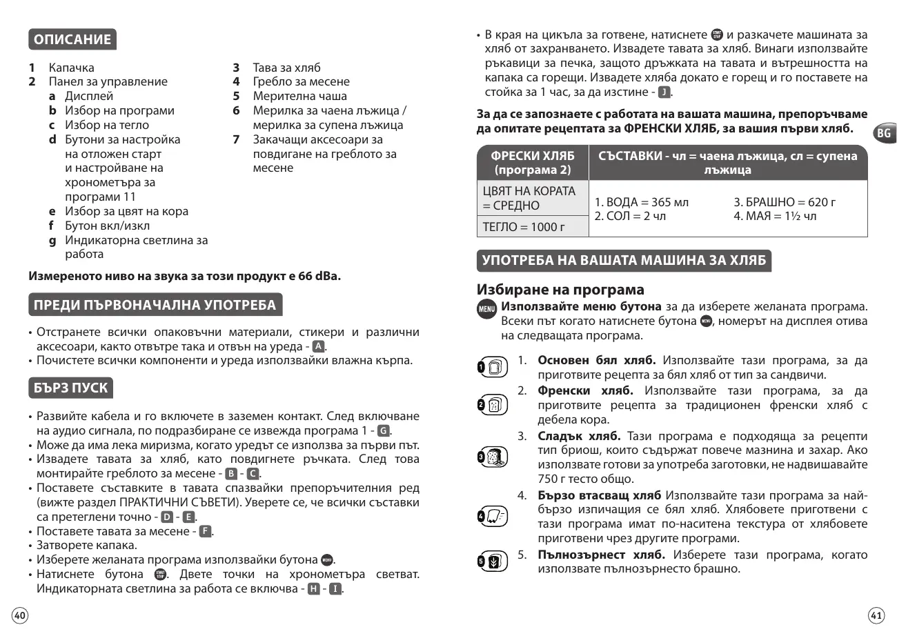 • Déroulez le cordon et branchez-le sur une prise électrique reliée à la terre. Après le signal sonore, le programme 1 s’affiche par défaut - G . • Une légère odeur peut se dégager lors de la première utilisation. • Retirez la cuve à pain en soulevant la poignée. Adaptez ensuite le mélangeur - B - C . • Ajoutez les ingrédients dans la cuve dans l’ordre préconisé (voir paragraphe CONSEILS PRATIQUES). Assurez-vous que tous les ingrédients soient pesés avec exactitude - D - E . • Introduisez la cuve à pain - F . • Fermez le couvercle. . • Sélectionnez le programme désiré à l’aide de la touche • Appuyez sur la touche . Les 2 points de la minuterie clignotent. Le temoin de fonctionnement s’allume - H - I . et débranchez la machine à pain. Retirez la cuve à • A la fin du cycle de cuisson, appuyez sur pain. Utilisez toujours des gants isolants car la poignée de la cuve est chaude ainsi que l’intérieur du couvercle. Démoulez le pain à chaud et placez-le 1 h sur une grille pour le refroidir - J .