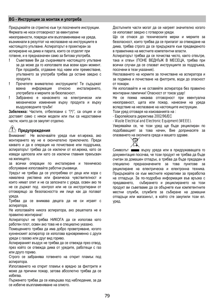 BG - Инструкции за монтаж и употреба Достъпните части могат да се нагреят значително когато се използват заедно с готварски уреди. Що се отнася до техническите мерки и мерките за безопасност, които трябва да се прилагат за отвеждане на дима, трябва строго да се придържате към предвиденото в правилника на местните компетентни власти. Аспираторът трябва да се почиства често, както отвътре, така и отвън (ПОНЕ ВЕДНЪЖ В МЕСЕЦА, трябва при всички случаи да се спазват инструкциите за поддръжка, посочени в тези указания). Неспазването на нормите за почистване на аспиратора и за подмяна и почистване на филтрите, води до опасност от пожари. Не използвайте и не оставяйте аспиратора без правилно монтирани лампички! Опасност от токов удар! Не се поема никаква отговорност при евентуална неизправност, щета или пожар, нанесени на уреда вследствие на неспазване на настоящите инструкции. Този уред отговаря на изискванията на : - Европейската директива 2002/96/ЕС - Waste Electricаl and Electronic Equipment (WEEE). Уверявайки се, че този уред ще бъде рециклиран по подобаващият за това начин, Вие допринасяте за опазването на околната среда и вашето здраве.