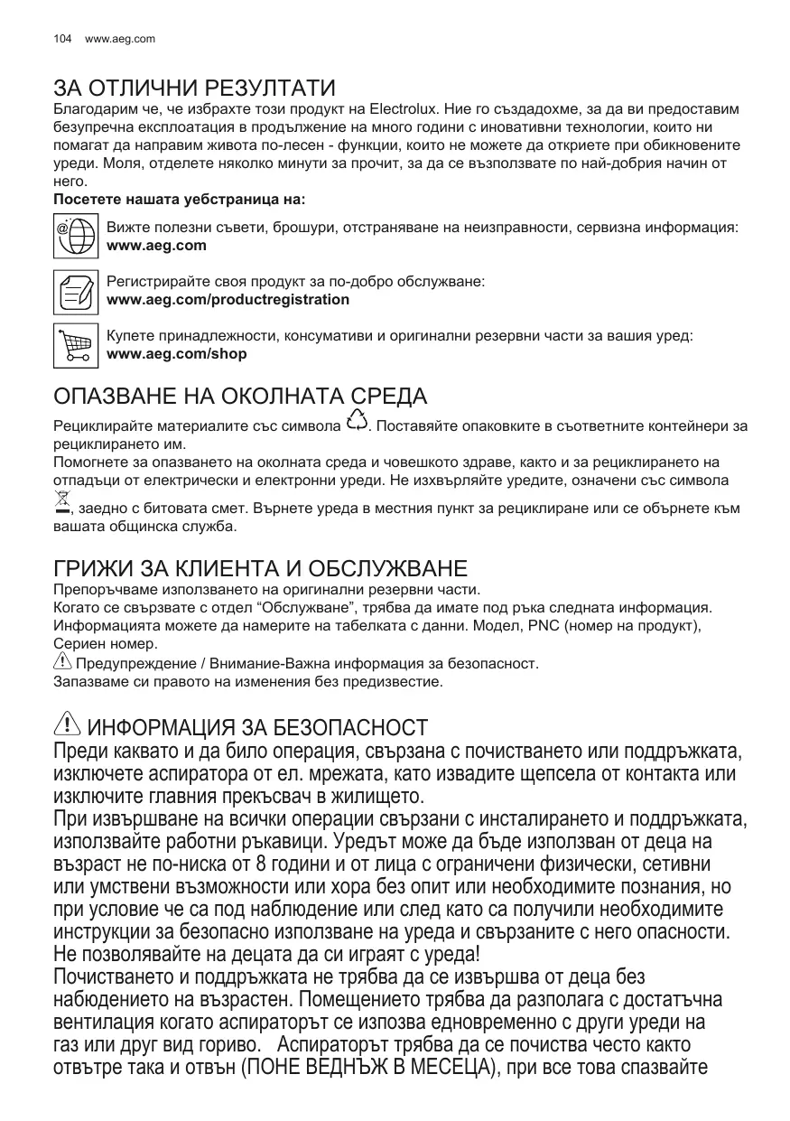 Благодарим че, че избрахте този продукт на Electrolux. Ние го създадохме, за да ви предоставим безупречна експлоатация в продължение на много години с иновативни технологии, които ни помагат да направим живота по-лесен - функции, които не можете да откриете при обикновените уреди. Моля, отделете няколко минути за прочит, за да се възползвате по най-добрия начин от него. Посетете нашата уебстраница на: Вижте полезни съвети, брошури, отстраняване на неизправности, сервизна информация: www.aeg.com Регистрирайте своя продукт за по-добро обслужване: www.aeg.com/productregistration Купете принадлежности, консумативи и оригинални резервни части за вашия уред: www.aeg.com/shop