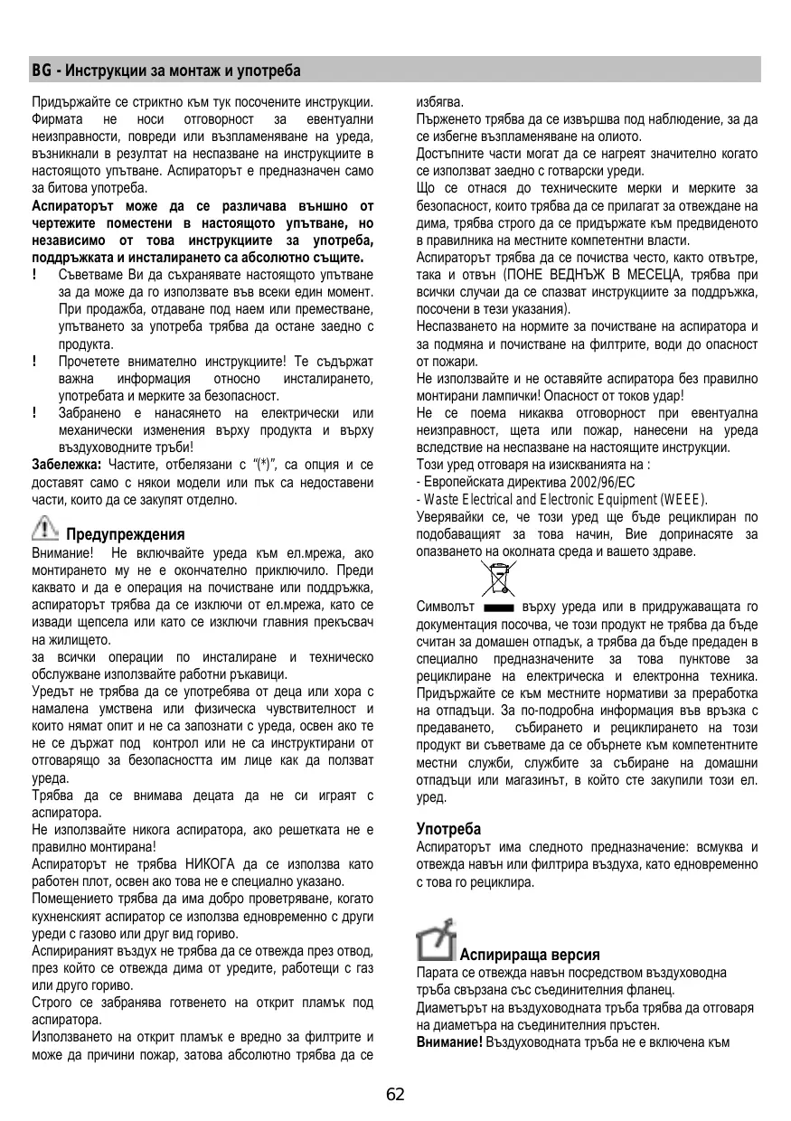 Attention! Ne pas raccorder l’appareil au circuit électrique avant que le montage ne soit complètement terminé. Avant toute opération de nettoyage ou d’entretien, débrancher la hotte du circuit électrique en retirant la prise ou en coupant l’interrupteur général de l’habitation. Munissez-vous de gants de travail avant d’effectuer toute opération d’installation et d’entretien. L’appareil n’est pas destiné à une utilisation par des enfants ou des personnes à capacités physiques, sensorielles ou mentales réduites et sans expérience et connaissance à moins qu’ils ne soient sous la supervision ou formés sur l’utilisation de l’appareil par une personne responsable de leur sécurité. Les enfants doivent être surveillés afin qu’ils ne jouent pas avec l’appareil. Ne jamais utiliser la hotte sans que la grille ne soit montée correctement! La hotte ne doit JAMAIS être utilisée comme plan pour déposer quelque chose sauf si cela est expressément indiqué. Quand la hotte est utilisée en même temps que d’autres appareils à combustion de gaz ou d’autres combustibles, le local doit disposer d’une ventilation suffisante. L’air aspiré ne doit jamais être envoyé dans un conduit utilisé pour l’évacuation des fumées produites par des appareils à combustion de gaz ou d’autres combustibles. Il est formellement interdit de faire flamber les aliments sous la hotte. L’utilisation de flammes libres peut entraîner des dégâts aux filtres et peut donner lieu à des incendies, il faut donc les éviter à tout prix. La friture d’aliments doit être réalisée sous contrôle pour éviter