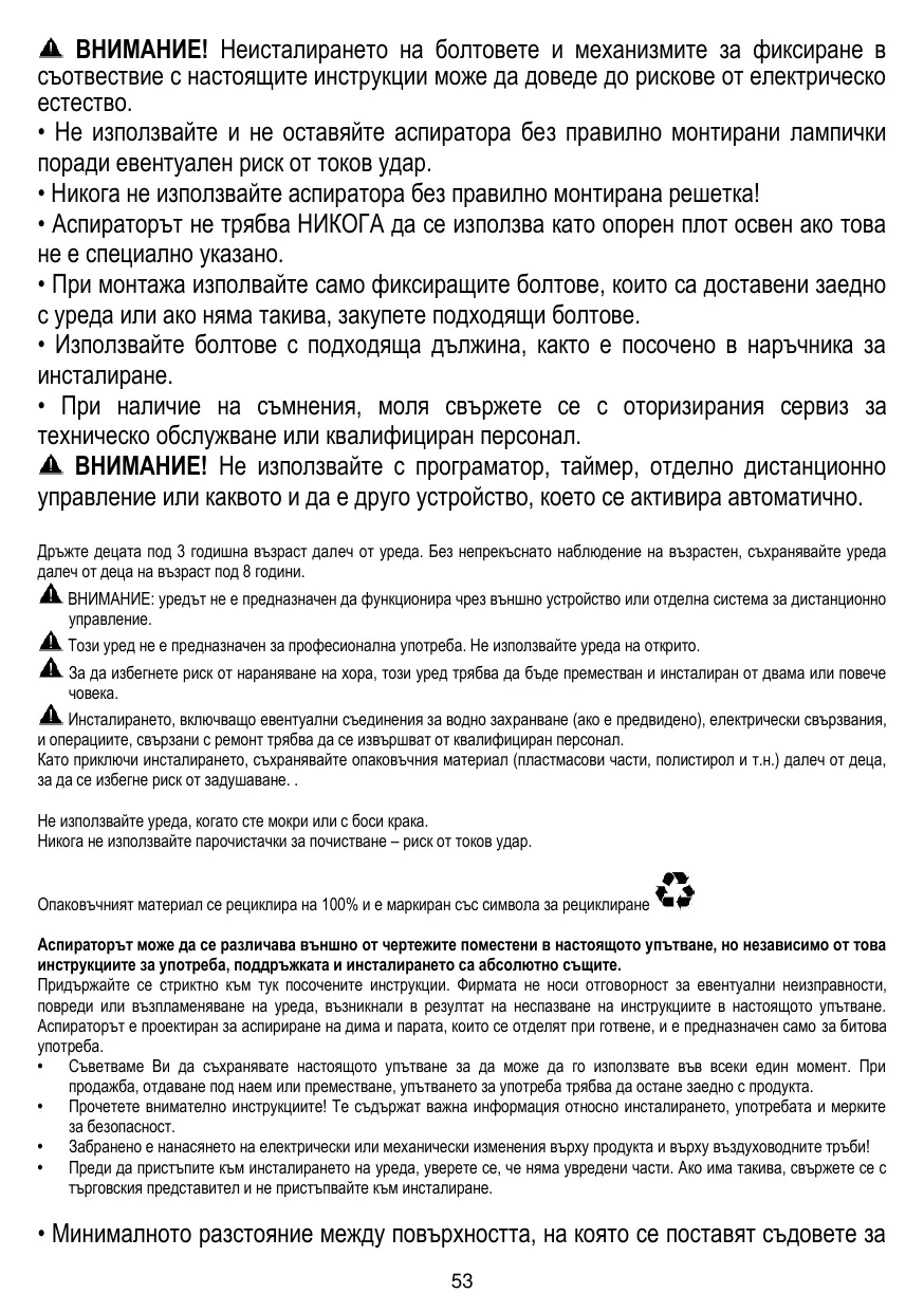 • Les enfants ne doivent pas jouer avec l’appareil. • Le nettoyage et l’entretien par l’usager ne doivent pas être effectués par des enfants sans surveillance. • La pièce doit avoir une aération suffisante lorsque la hotte est utilisée conjointement avec d'autres appareils fonctionnant au gaz ou autres combustibles. • La hotte doit être régulièrement nettoyée à la fois à l'intérieur et à l'extérieur (AU MOINS UNE FOIS PAR MOIS); cela devrait se faire en conformité avec les instructions d'entretien. Le non respect des instructions expressément fournies concernant le nettoyage de la hotte et des filtres peut provoquer des risques d'incendie. • Ne pas flamber d’aliments sous la hotte. • Pour le remplacement de la lampe, utilisez uniquement le type de lampe spécifié dans la section remplacement/maintenance lampe dans ce manuel. L'utilisation d'une flamme nue est dommageable pour les filtres et peut causer un incendie, par conséquent, il est déconseillé de l'utiliser. La friture doit être faite avec soin afin de s’assurer que l’huile surchauffée ne prenne pas feu. AVERTISSEMENT: Lorsque la table de cuisson est en fonctionnement, les parties accessibles de la hotte peuvent devenir très chaudes. • Ne pas brancher l'appareil au réseau électrique avant que l'installation ne soit complètement terminée. • En ce qui concerne les mesures techniques et de sécurité à prendre pour l'évacuation des fumées, respectez strictement les dispositions des règlements locales. • L’air ne doit pas être envoyé dans un conduit utilisé pour évacuer les fumées d’appareils utilisant du gaz ou un autre combustible. ATTENTION ! Le défaut d'installer les vis et les dispositifs de fixation conformément à ces instructions peut entraîner des risques électriques. • Ne pas utiliser ou laisser la hotte sans les lampes correctement montées, car un éventuel risque de choc électrique est possible. • N’utilisez jamais la hotte sans la grille montée correctement! • La hotte ne doit JAMAIS être utilisée comme une surface d'appui, sauf indication expresse. • Utilisez uniquement les vis de fixation fournies avec le produit pour l'installation, ou, si 17