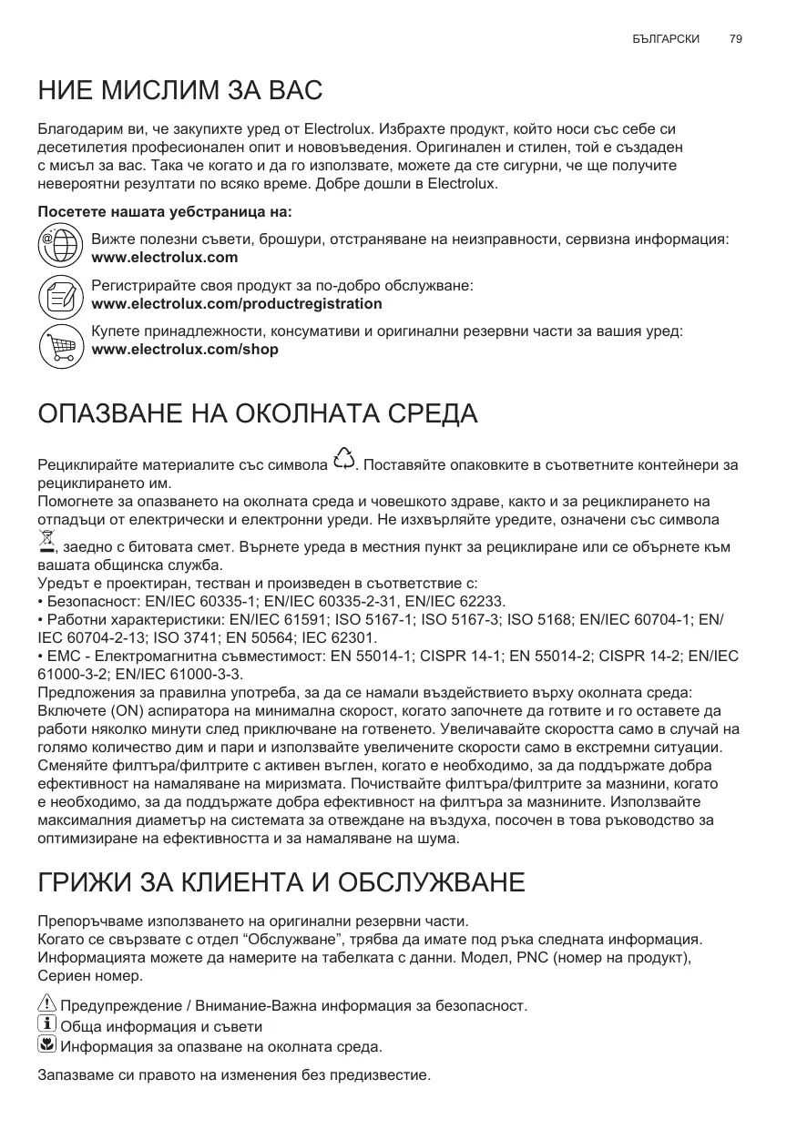 - EMC - Електромагнитна съвместимост: EN 55014-1; CISPR 14-1; EN 55014-2; CISPR 14-2; EN/IEC 61000-3-2; EN/IEC 61000-3-3. Предложения за правилна употреба, за да се намали въздействието върху околната среда: Включете (ON) аспиратора на минимална скорост, когато започнете да готвите и го оставете да работи няколко минути след приключване на готвенето. Увеличавайте скоростта само в случай на голямо количество дим и пари и използвайте увеличените скорости само в екстремни ситуации. Сменяйте филтъра/филтрите с активен въглен, когато е необходимо, за да поддържате добра ефективност на намаляване на миризмата. Почиствайте филтъра/филтрите за мазнини, когато е необходимо, за да поддържате добра ефективност на филтъра за мазнините. Използвайте максималния диаметър на системата за отвеждане на въздуха, посочен в това ръководство за оптимизиране на ефективността и за намаляване на шума. ГРИЖИ ЗА КЛИЕНТА И ОБСЛУЖВАНЕ Препоръчваме използването на оригинални резервни части. Когато се свързвате с отдел “Обслужване”, трябва да имате под ръка следната информация. Информацията можете да намерите на табелката с данни. Модел, PNC (номер на продукт), Сериен номер. Предупреждение / Внимание-Важна информация за безопасност. Обща информация и съвети Информация за опазване на околната среда. Запазваме си правото на изменения без предизвестие.