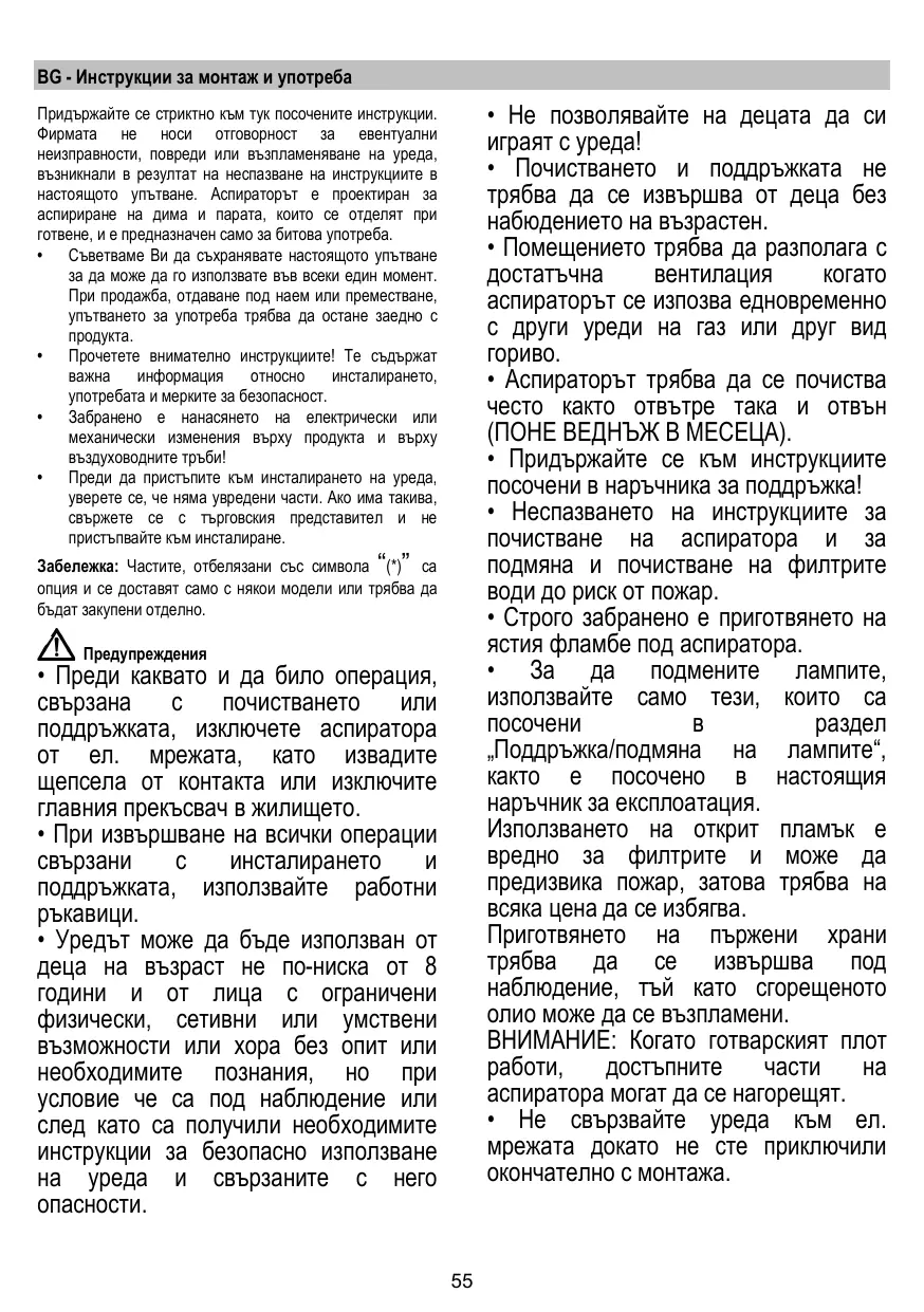 • Преди каквато и да било операция, свързана с почистването или поддръжката, изключете аспиратора от ел. мрежата, като извадите щепсела от контакта или изключите главния прекъсвач в жилището. • При извършване на всички операции свързани с инсталирането и поддръжката, използвайте работни ръкавици. • Уредът може да бъде използван от деца на възраст не по-ниска от 8 години и от лица с ограничени физически, сетивни или умствени възможности или хора без опит или необходимите познания, но при условие че са под наблюдение или след като са получили необходимите инструкции за безопасно използване на уреда и свързаните с него опасности. 55