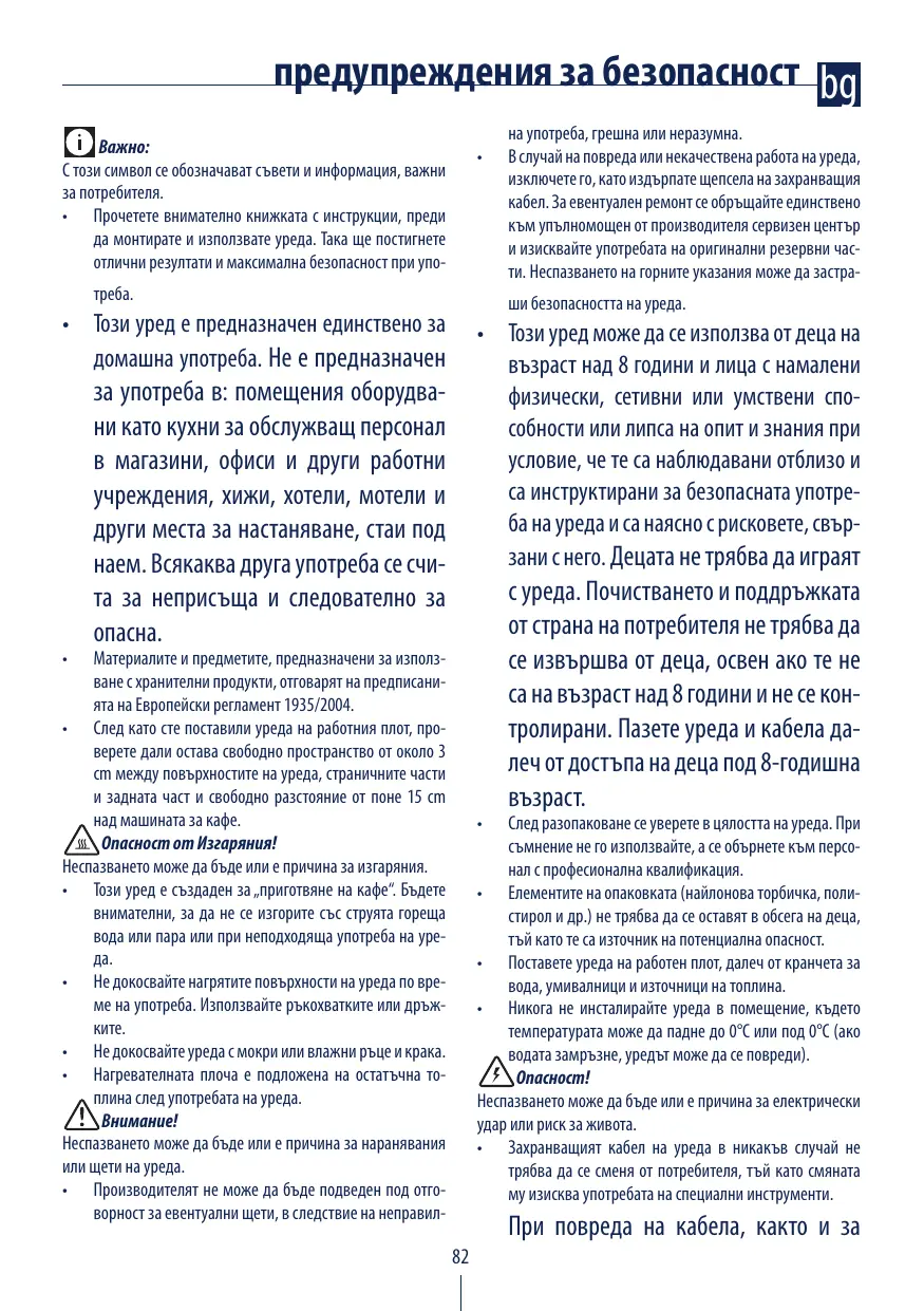 Les matières et les objets destinés au contact avec des produits alimentaires sont conformes au règlement européen 1935/2004. • Après avoir placé l’appareil sur le plan de travail, veillez à ce qu’il reste un espace d’environ 5 cm tout autour de la machine à café et de 20 cm au moins au-dessus. Danger Brûlures ! Risque de brûlures. • Cet appareil est fabriqué pour “faire du café”. Attention aux brûlures causées par les projections d’eau chaude ou de vapeur ou par une mauvaise utilisation de l’appareil. • Pendant l’utilisation ne touchez pas les surfaces chaudes de l’appareil. Ne touchez que les boutons ou les poignées. • Évitez de toucher l’appareil les mains ou les pieds mouillés ou humides. • La plaque chauffante reste chaude après l’utilisation de l’appareil. Attention ! Le non-respect de ces consignes peut provoquer des blessures ou endommager l’appareil. • Le fabricant ne peut être tenu pour responsable des dommages éventuellement causés par une mauvaise utilisation ou une utilisation non conforme aux instructions. • En cas de panne ou de mauvais fonctionnement de l’ap-