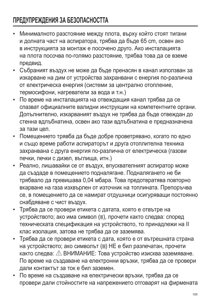 ▪ L’air aspiré ne doit pas être canalisé dans un conduit qui est utilisé pour évacuer les fumées produites par des appareils alimentés par des sources d’énergies autres que l’énergie électrique (installations de chauffage central, radiateurs, chauffe-eau, etc.). ▪ Pour évacuer l’air qui doit être éliminé respectez les prescriptions des autorités compétentes. De plus l’air qui doit être évacué ne doit pas être déchargé dans une cavité du mur, à moins que cette cavité soit prévue pour ce but. ▪ Prévoyez une aération de la pièce adéquate quand une hotte et des appareils alimentés par une énergie autre que l’énergie électrique (poêle à gaz, à huile, à charbon etc.) sont utilisés en même temps. En effet, en évacuant l’air, la hotte pourrait créer une dépression dans la pièce. La pression négative de la pièce ne doit pas dépasser 0,04mbar, évitant ainsi que la source de chaleur provoque un appel des gaz qui doivent être évacués. Il est donc nécessaire d’équiper la pièce de prises d’air alimentant un flux d’air frais constant. ▪ Contrôler la plaque des caractéristiques techniques se trouvant à l’intérieur de l’appareil; si le symbole ( ) figure sur la plaque suivre les instructions suivantes: cet appareil est construit pour appartenir à la classe d’isolation II ; il ne doit donc pas être relié à la terre. ▪ Contrôler la plaque des caractéristiques techniques se trouvant à l’intérieur de l’appareil; si le symbole ( ) NE figure pas sur la plaque suivre les instructions suivantes: ATTENTION: cet appareil doit être relié à la terre. Lors du raccordement électrique s’assurer que la prise de courant est équipée d’une connexion de mise à la terre. ▪ Lors du raccordement électrique assurez-vous que les valeurs de tension correspondent à celles qui sont indiquées sur la plaque des caractéristiques de l’appareil, qui se trouve à l’intérieur de celui-ci. Si votre appareil, n’a pas de câble flexible qui ne peut pas être séparé ni de prise, ou bien d’autre dispositif qui garantisse le débranchement de tous les 10