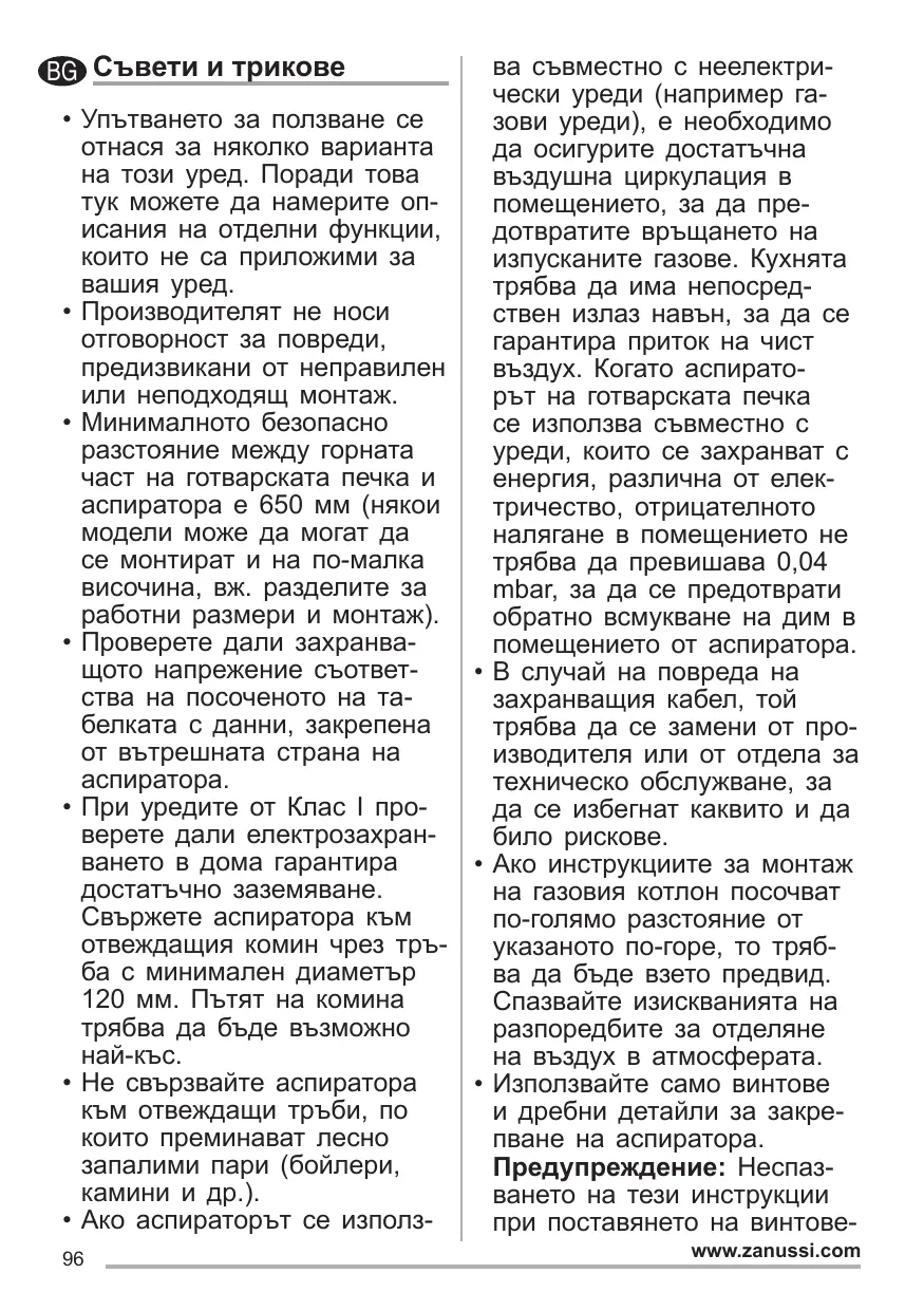 • Si vous utilisez l’aspirateur en combinaison avec des appareils non électriques (par ex. appareils à gaz), vous devez garantir un degré d’aération suffisant dans la pièce, afin d’empêcher le retour du flux des gaz de sortie. La cuisine doit présenter une ouverture communiquant directement vers l’extérieur pour garantir l’amenée d’air propre.