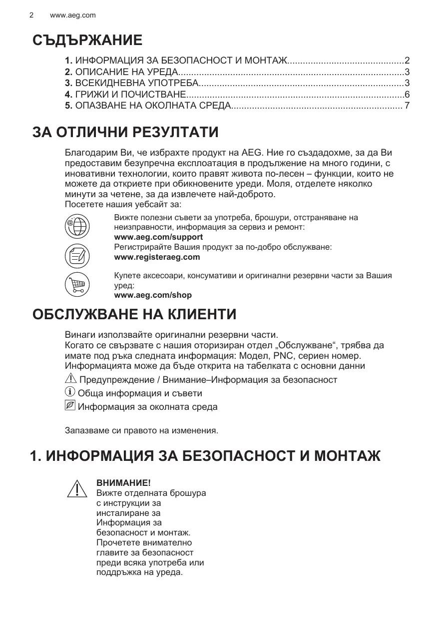 Enregistrer votre produit pour un meilleur service : www.registeraeg.com Acheter des accessoires, consommables et pièces de rechange d’origine pour votre appareil : www.aeg.com/shop