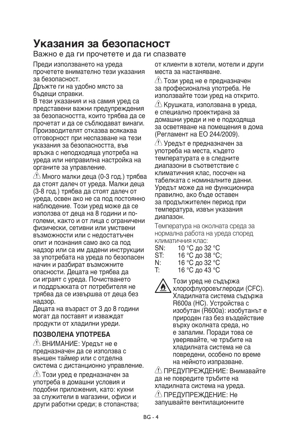 Важно е да ги прочетете и да ги спазвате Преди използването на уреда прочетете внимателно тези указания за безопасност. Дръжте ги на удобно място за бъдещи справки. В тези указания и на самия уред са представени важни предупреждения за безопасността, които трябва да се прочетат и да се съблюдават винаги. Производителят отказва всякаква отговорност при неспазване на тези указания за безопасността, във връзка с неподходяща употреба на уреда или неправилна настройка на органите за управление. Много малки деца (0-3 год.) трябва да стоят далеч от уреда. Малки деца (3-8 год.) трябва да стоят далеч от уреда, освен ако не са под постоянно наблюдение. Този уред може да се използва от деца на 8 години и поголеми, както и от лица с ограничени физически, сетивни или умствени възможности или с недостатъчен опит и познания само ако са под надзор или са им дадени инструкции за употребата на уреда по безопасен начин и разбират възможните опасности. Децата не трябва да си играят с уреда. Почистването и поддръжката от потребителя не трябва да се извършва от деца без надзор. Децата на възраст от 3 до 8 години могат да поставят и изваждат продукти от хладилни уреди. ПОЗВОЛЕНА УПОТРЕБА ВНИМАНИЕ: Уредът не е предназначен да се използва с външен таймер или с отделна система с дистанционно управление. Този уред е предназначен за употреба в домашни условия и подобни приложения, като: кухни за служители в магазини, офиси и други работни среди; в стопанства;