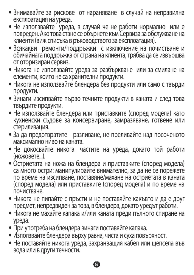 Toute erreur de branchement annule la garantie. • Votre appareil est destiné uniquement à un usage domestique à l’intérieur de la maison et à une altitude inférieure à 2000m. • La garantie ne s’appliquera pas en cas d’utilisation commerciale, inappropriée, ou non respect de la notice. • Toujours déconnecter l’appareil de l’alimentation si on le laisse sans surveillance et avant montage, démontage ou nettoyage. • Attention aux risques de blessure en cas de mauvaise utilisation de l’appareil. • N’utilisez pas votre appareil s’il ne fonctionne pas correctement ou s’il a été endommagé. Dans ce cas, adressez-vous à un centre service agréé (voir liste dans le livret service). • Toute intervention autre que le nettoyage et l’entretien usuel par le client doit être effectuée par un centre service agréé. • N’utilisez jamais cet appareil pour mélanger ou mixer d’autres éléments que des ingrédients alimentaires. • N’utilisez jamais le bol mixeur sans ingrédient ou avec des ingrédients solides uniquement. • Versez toujours les ingrédients liquides en premier dans le bol mixeur avant d’ajouter les ingrédients solides. • Ne pas utiliser le bol mixeur ou les accessoires (selon modèle) comme récipients (conservation, congélation, cuisson, stérilisation) • Afin d’éviter tout débordement, ne pas dépasser le niveau maximum du bol lorsque celui-ci est indiqué. • N e touchez jamais les pièces en mouvement (couteaux…). • Les lames du couteau du bol mixeur et des accessoires (selon modèle) sont très coupantes: manipulez-les avec précaution pour ne pas vous blesser lors du versage, du montage/démontage des 1