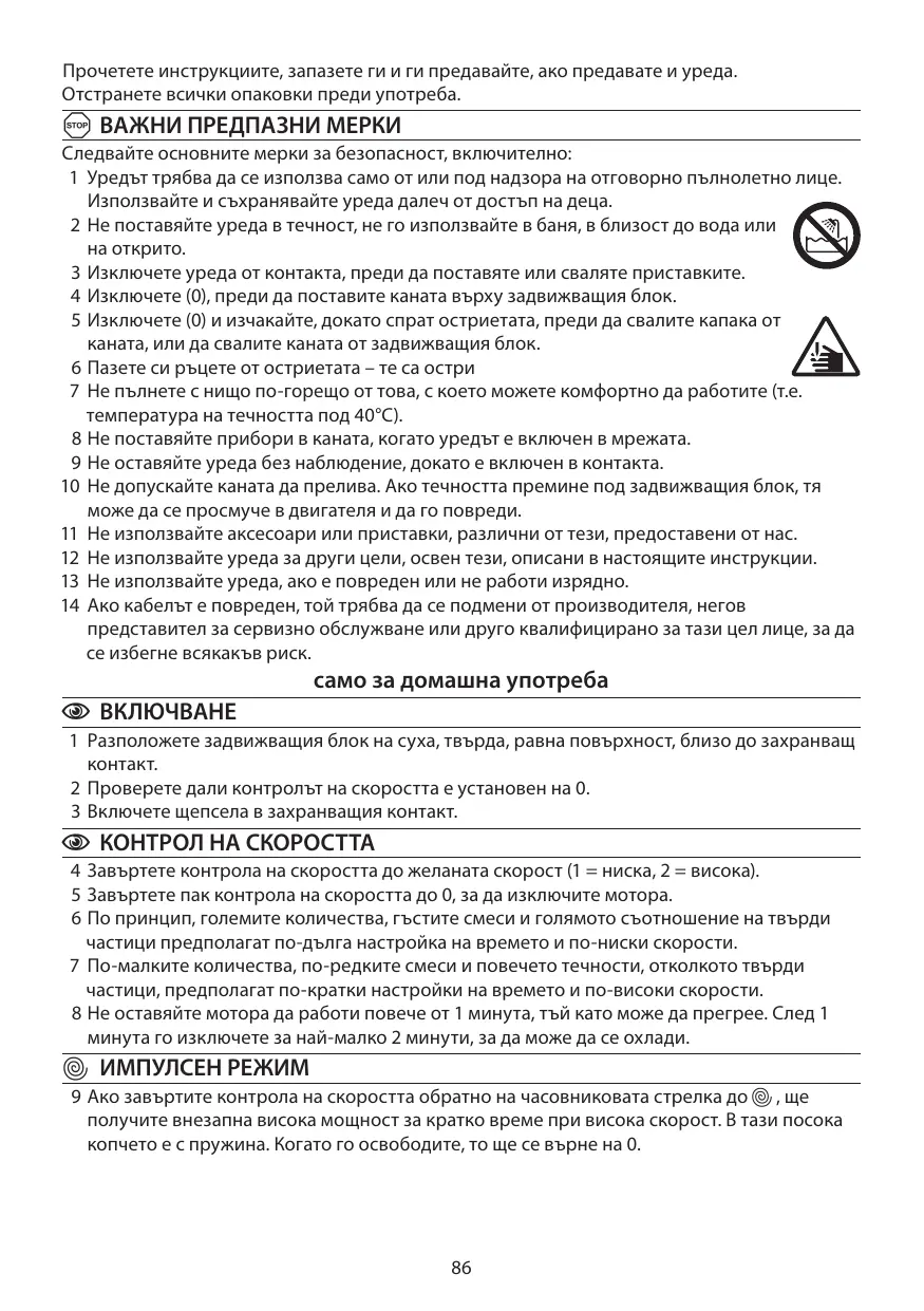 2 N’immergez pas l’appareil dans un liquide, ne l’utilisez pas dans une salle de bains, à proximité d’une source d’eau ou à l’extérieur. 3 Débranchez l’appareil avant d’adapter ou de retirer les accessoires. 4 Eteignez (0) avant de mettre le bol en place sur le bloc moteur. 5 Eteignez (0) et attendez jusqu’à ce que les lames s’arrêtent avant d’enlever le couvercle du bol ou avant d’enlever le bol du bloc moteur. 6 Tenez vos mains à l’écart des lames – elles sont tranchantes 7 Ne remplissez pas avec quelque chose de trop chaud qui n’est plus agréable au toucher pour vous (par ex. températures des liquides inférieures à 40°C). 8 Ne placez aucun ustensile dans le bol lorsque l’appareil est branché. 9 Ne laissez pas l’appareil sans surveillance lorsqu’il est branché. 10 Veillez à ce que le bol ne déborde pas. Tout liquide qui se met sous le bloc moteur pourrait être absorbé par le moteur et risquerait de l’endommager. 11 N’adaptez pas d’accessoires autres que ceux fournis. 12 N’utilisez pas l’appareil à d’autres fins que celles décrites dans ce mode d’emploi. 13 N’utilisez pas l’appareil s’il est endommagé ou ne fonctionne pas correctement. 14 Si le câble est abîmé, vous devez le faire remplacer par le fabricant, un de ses techniciens agréés ou une personne également qualifiée, pour éviter tout danger.