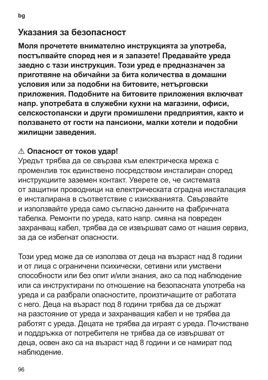 Congratulations on purchasing this Siemens appliance. You have acquired a high-quality product that will bring you a lot of enjoyment. This instruction manual describes two models: ¡ Risque de chocs électriques ! L‘appareil doit être branché uniquement sur un réseau à courant alternatif par l‘intermédiaire d‘une prise secteur installée de manière conforme et disposant d‘une connexion à la terre. Assurez vous que le système à conducteur de protection de l’installation électrique de votre maison soit conforme. Ne brancher et n’utiliser l’appareil que conformément aux données indiquées sur la plaque signalétique. Les réparations sur l’appareil telles que le remplacement d’un cordon endommagé ne doivent être effectuées que par notre SAV afin d’éliminer tout danger. Cet appareil peut être utilisé par des enfants à partir de 8 ans et par des personnes ayant des facultés physiques, sensorielles ou mentales réduites ou manquant d’expérience et/ou de connaissances à condition d’être surveillés ou d’avoir été informés quant à la bonne utilisation de l’appareil et d’avoir compris les dangers qui en découlent. Les enfants de moins de 8 ans doivent être tenus éloignés de l’appareil et du cordon d’alimentation et ne doivent pas utiliser l’appareil. Ne pas laisser les enfants jouer avec l’appareil. Le nettoyage et l’entretien incombant à l’utilisateur ne doivent pas être effectués par des enfants sauf s’ils ont 8 ans ou plus et sont surveillés. 14