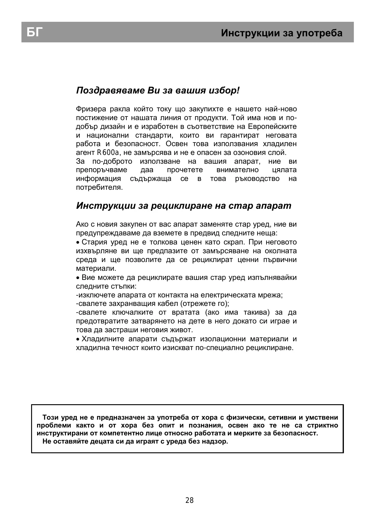 Поздравяваме Ви за вашия избор! /28 Ръководство за ползване /29 Инструкции за транспорт /29 Предупреждение и общи съвети /29 Монтаж на уреда /30 Свързване с електрическата мрежа /31 Ръководство за ползване /31 Работа с апарата /31 Описание на уреда /31 Работа с фризера /31 Ръководство за ползване /32 Ръководство за ползване /33 Почистване от вътре /33 Почистване от вън /34 Ръководство за ползване /34 Шум по време на работа на апарата /35