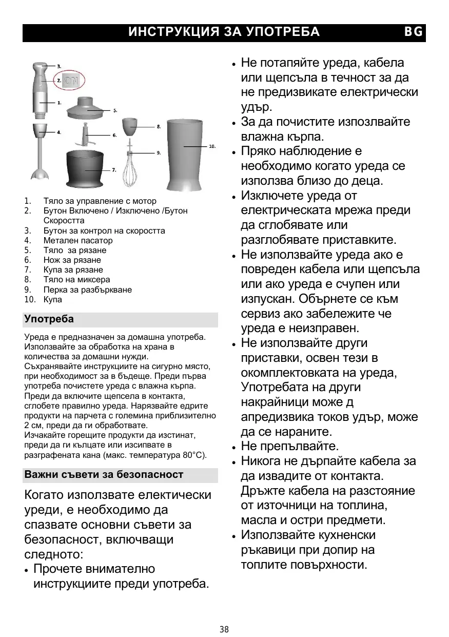 Не потапяйте уреда, кабела или щепсъла в течност за да не предизвикате електрически удър. За да почистите изпозлвайте влажна кърпа. Пряко наблюдение е необходимо когато уреда се използва близо до деца. Изключете уреда от електрическата мрежа преди да сглобявате или разглобявате приставките. Не използвайте уреда ако е повреден кабела или щепсъла или ако уреда е счупен или изпускан. Обърнете се към сервиз ако забележите че уреда е неизправен. Не използвайте други приставки, освен тези в окомплектовката на уреда, Употребата на други накрайници може д апредизвика токов удър, може да се нараните. Не препълвайте. Никога не дърпайте кабела за да извадите от контакта. Дръжте кабела на разстояние от източници на топлина, масла и остри предмети. Използвайте кухненски ръкавици при допир на топлите повърхности.