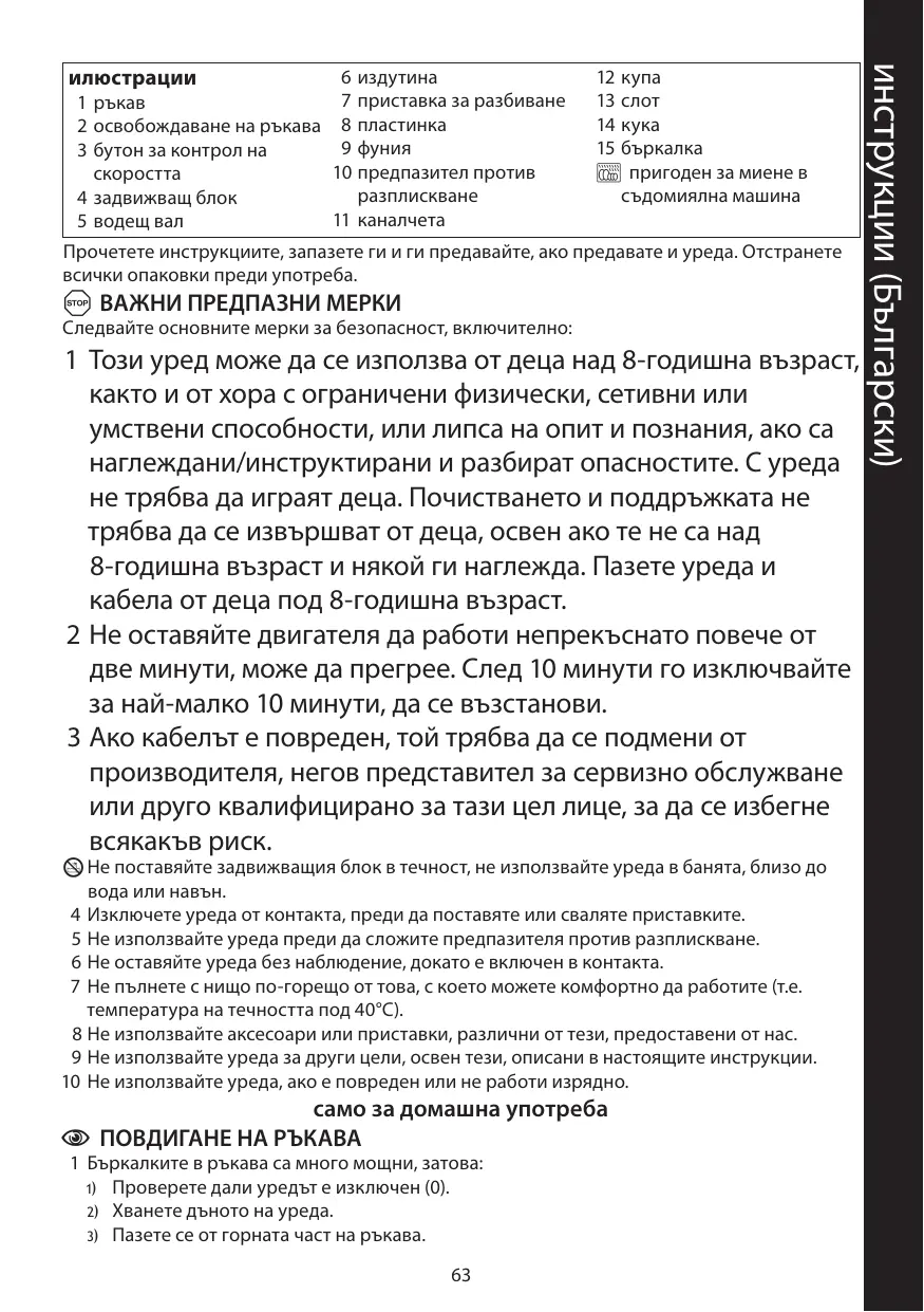 4 Débranchez l’appareil avant d’adapter ou de retirer les accessoires. 5 N'utilisez pas l'appareil sans installer la protection anti-éclaboussures. 6 Ne laissez pas l’appareil sans surveillance lorsqu’il est branché. 7 Ne remplissez pas avec quelque chose de trop chaud qui n’est plus agréable au toucher pour vous (par ex. températures des liquides inférieures à 40°C). 8 N’adaptez pas d’accessoires autres que ceux fournis. 9 N’utilisez pas l’appareil à d’autres fins que celles décrites dans ce mode d’emploi. 10 N’utilisez pas l’appareil s’il est endommagé ou ne fonctionne pas correctement.