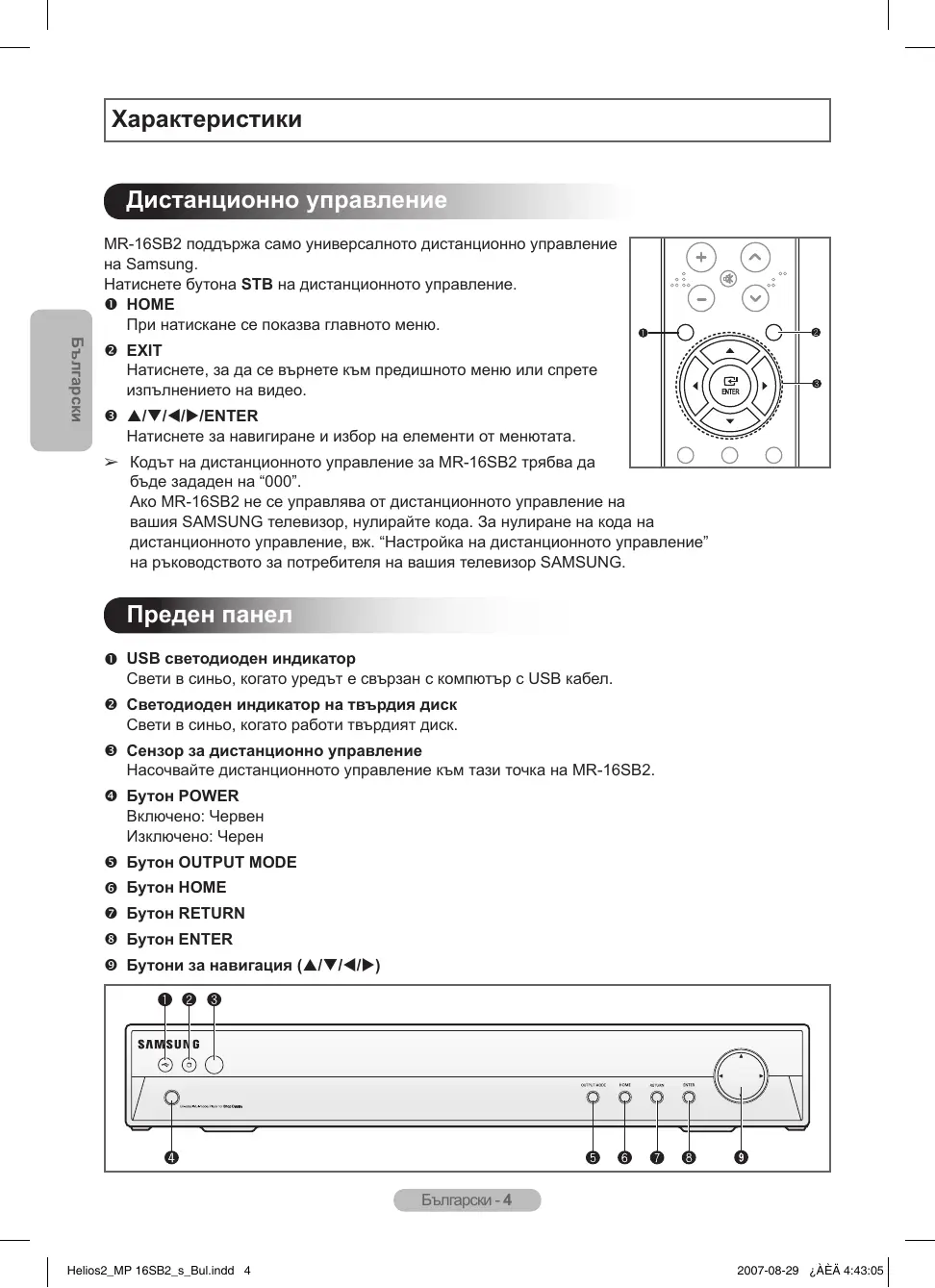 HOME Le menu principal s’affiche lorsque vous appuyez sur ce bouton. EXIT Appuyez sur ce bouton pour revenir au menu précédent ou arrêter la lecture de la vidéo. ////ENTER Appuyez sur ces boutons pour parcourir et sélectionner les options de menu. ➢ Le code de télécommande du MR-16SB2 doit être réglé sur “000”. Si vous ne commandez pas le MR-16SB2 à l’aide de la télécommande de votre téléviseur SAMSUNG, réinitialisez le code de la télécommande. Pour définir ce code, reportez-vous à la section “Réglage de la télécommande” du mode d’emploi du téléviseur SAMSUNG.