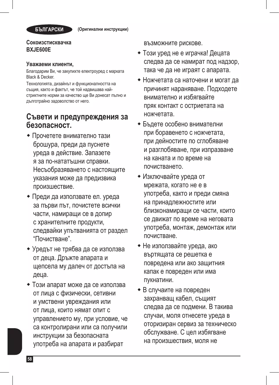 (Оригинални инструкции) Сокоизстисквачкa BXJE600E Уважаеми клиенти, Благодарим Ви, че закупихте електроуред с марката Black & Decker. Технологията, дизайнът и функционалността на същия, както и фактът, че той надвишава найстриктните норми за качество ще Ви донесат пълно и дълготрайно задоволство от него. Съвети и предупреждения за безопасност. Прочетете внимателно тази брошура, преди да пуснете уреда в действие. Запазете я за по-нататъшни справки. Несъобразяването с настоящите указания може да предизвика произшествие. Преди да използвате ел. уреда за първи път, почистете всички части, намиращи се в допир с хранителните продукти, следвайки упътванията от раздел “Почистване”. Уредът не трябва да се използва от деца. Дръжте апарата и щепсела му далеч от достъпа на Този апарат може да се използва от лица с физически, сетивни и умствени увреждания или от лица, които нямат опит с управлението му, при условие, че са контролирани или са получили инструкции за безопасната употреба на апарата и разбират