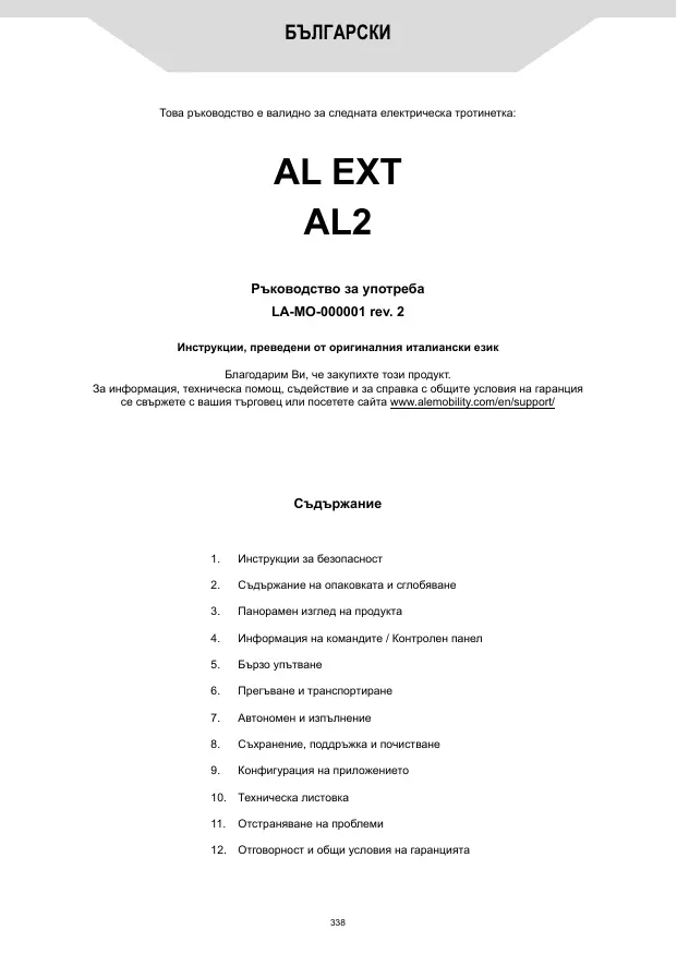N'utilisez pas d'accessoires et / ou de pièces supplémentaires non approuvés par le fabricant. Tenez les enfants à l'écart des pièces en plastique (y compris les matériaux d'emballage) et des petites pièces qui peuvent provoquer une suffocation. Il est interdit de modifier ou de transformer le produit ou ses parties de quelque manière que ce soit, car cela pourrait nuire à l'efficacité, à la structure et causer des dommages. Si vous détectez des défauts d'usine, des bruits inhabituels ou des anomalies, ne conduisez pas le véhicule et contactez votre concessionnaire ou visitez le site www.alemobility.com/en/ pour bénéficier de l’assistance technique.