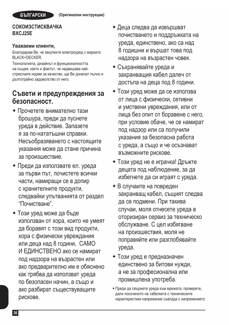 (Оригинални инструкции) СОКОИЗСТИСКВАЧКА BXCJ25E Уважаеми клиенти, Благодарим Ви, че закупихте електроуред с марката BLACK+DECKER. Технологията, дизайнът и функционалността на същия, както и фактът, че надвишава найстриктните норми за качество, ще Ви донесат пълно и дълготрайно задоволство от него. Съвети и предупреждения за безопасност. Прочетете внимателно тази брошура, преди да пуснете уреда в действие. Запазете я за по-нататъшни справки. Несъобразяването с настоящите указания може да стане причина за произшествие. Преди да използвате ел. уреда за първи път, почистете всички части, намиращи се в допир с хранителните продукти, следвайки упътванията от раздел “Почистване”. Този уред може да бъде използван от хора, които не умеят да боравят с този вид продукти, хора с физически увреждания или деца над 8 години, САМО И ЕДИНСТВЕНО ако се намират под надзора на възрастен или ако предварително им е обяснено как трябва да използват уреда по безопасен начин, а също и ако разбират съществуващите