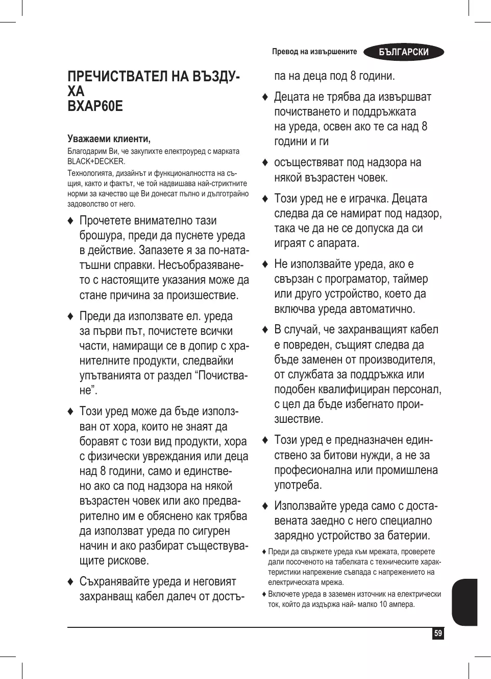 па на деца под 8 години. ♦♦ Децата не трябва да извършват почистването и поддръжката на уреда, освен ако те са над 8 години и ги ♦♦ осъществяват под надзора на някой възрастен човек. ♦♦ Този уред не е играчка. Децата следва да се намират под надзор, така че да не се допуска да си играят с апарата. ♦♦ Не използвайте уреда, ако е свързан с програматор, таймер или друго устройство, което да включва уреда автоматично. ♦♦ В случай, че захранващият кабел е повреден, същият следва да бъде заменен от производителя, от службата за поддръжка или подобен квалифициран персонал, с цел да бъде избегнато произшествие. ♦♦ Този уред е предназначен единствено за битови нужди, а не за професионална или промишлена употреба. ♦♦ Използвайте уреда само с доставената заедно с него специално зарядно устройство за батерии. ♦♦Преди да свържете уреда към мрежата, проверете дали посоченото на табелката с техническите характеристики напрежение съвпада с напрежението на електрическата мрежа. ♦♦Включете уреда в заземен източник на електрически ток, който да издържа най- малко 10 ампера. 59