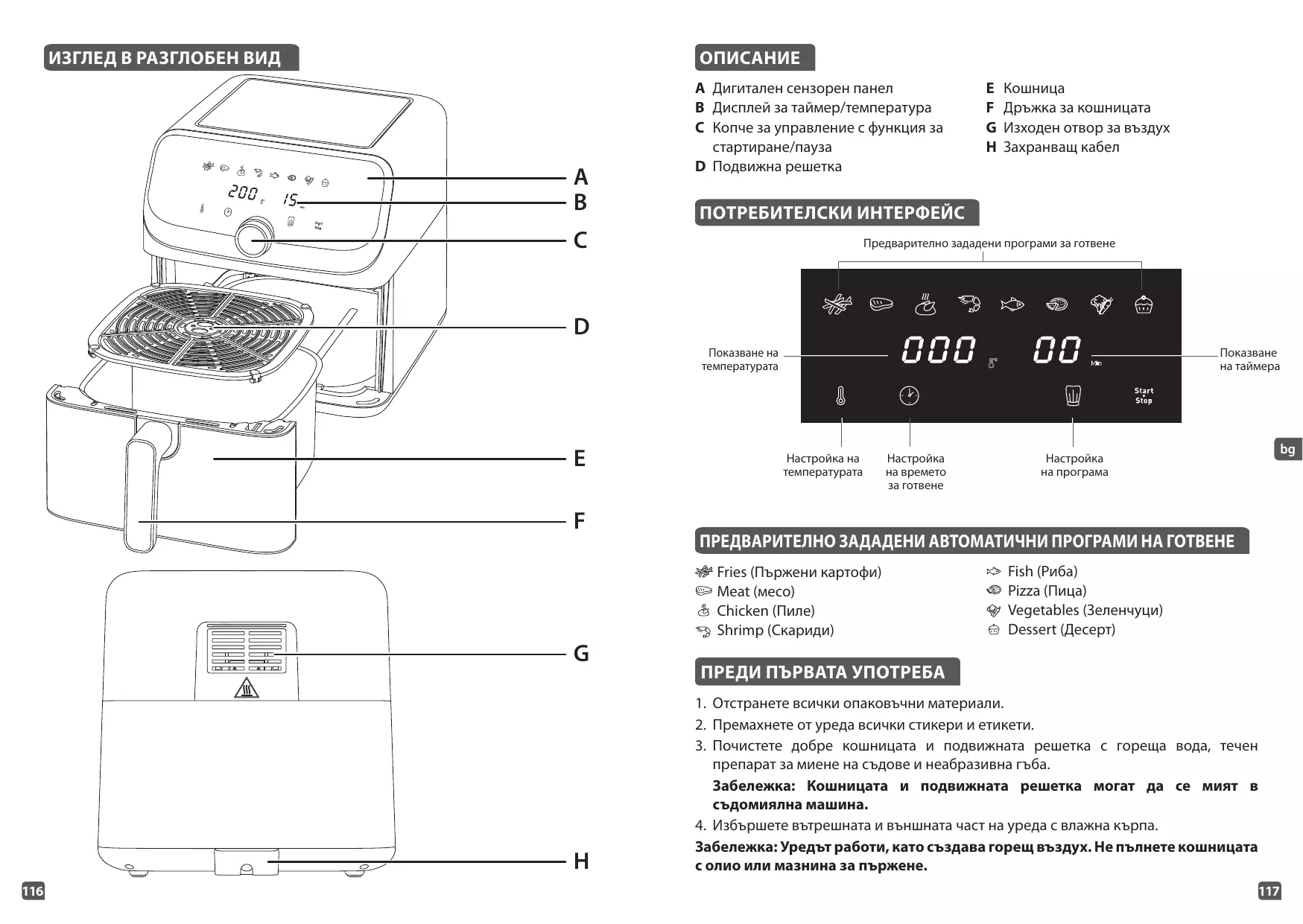 Carne Pollo 4. Introduce de nuevo la cesta en el aparato. • Precaución: No toques la cesta durante el uso ni algún tiempo después del uso, ya que se pone muy caliente. Sujeta la cesta únicamente por el asa. 5. Pulsa para encender el aparato. La pantalla muestra el programa predeterminado “Manual”: 200 °C/15 minutos. El botón parpadeará. 6. Puedes seleccionar entre el modo de cocinado preestablecido o los ajustes manuales. a. Si seleccionas el modo de cocinado preestablecido : • D espués de cocinar, la cesta, la rejilla y la comida están muy calientes. Ten cuidado. Usa ambas manos y un guante de horno si la cesta es demasiado pesada. • T en cuidado porque, en función del tipo de comida que hayas hecho en el aparato, la cesta puede soltar vapor muy caliente. 13. Cuando una tanda de alimentos está lista, el aparato estará preparado para cocinar otra tanda al instante. 14. Si deseas terminar el cocinado antes del final del programa, mantén pulsado el botón durante 2 segundos para apagar el aparato.