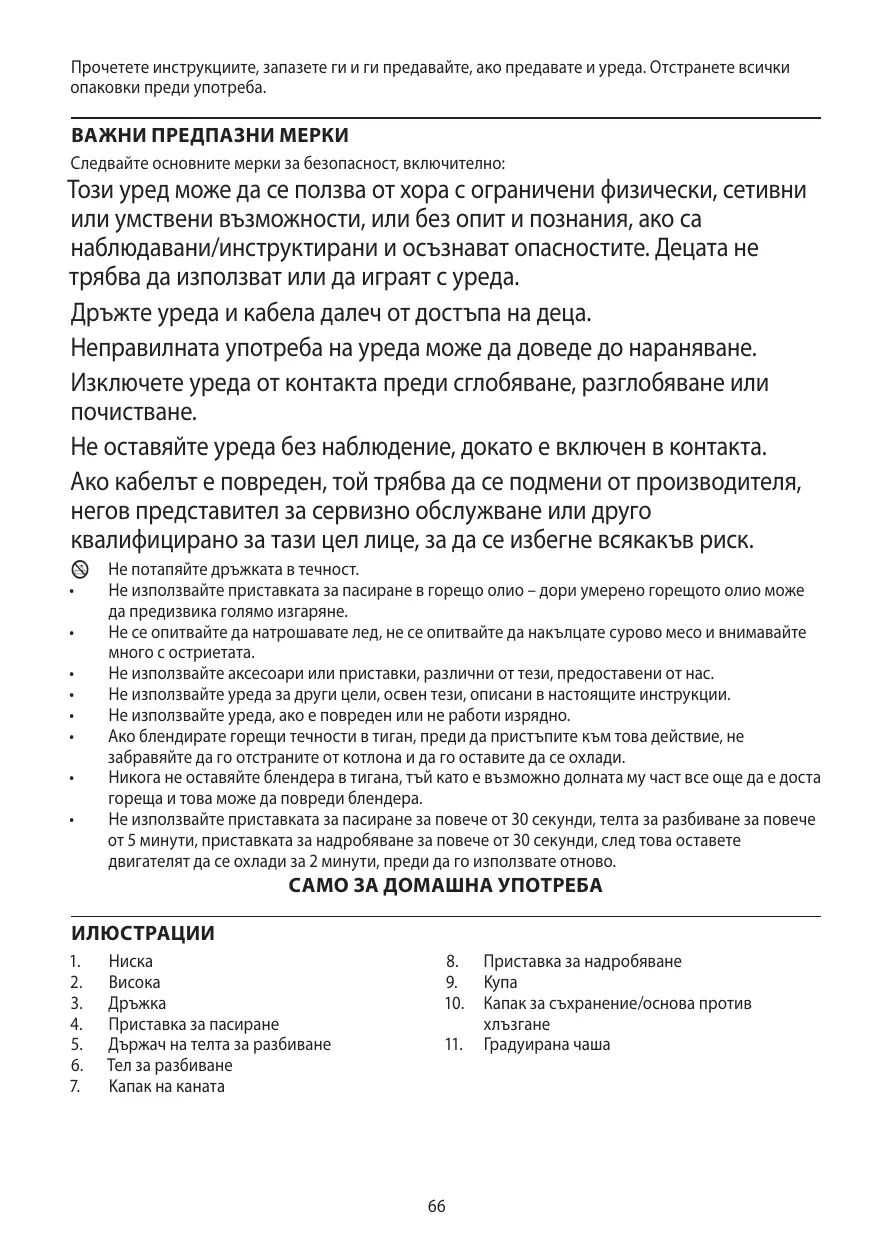 Les enfants ne doivent pas utiliser ni jouer avec l'appareil. Tenez l'appareil et le câble hors de portée des enfants. Une utilisation inappropriée de l'appareil peut causer des blessures. Débranchez l'appareil avant le montage, le démontage ou le nettoyage. Ne laissez pas l’appareil sans surveillance lorsqu’il est branché. Si le câble est abîmé, vous devez le faire remplacer par le fabricant, un de ses techniciens agréés ou une personne également qualifiée, pour éviter tout danger. H • • N’essayez pas de piler de la glace ou de hacher de la viande crue et faites attention aux lames. N’adaptez pas d’accessoires autres que ceux fournis. N’utilisez pas l’appareil dans un autre but que celui décrit dans ces instructions. N’utilisez pas l’appareil s’il est endommagé ou s’il ne fonctionne pas correctement. Si vous mélangez des liquides chauds dans une casserole, retirez dans tous les cas la casserole de la source de chaleur et laissez-la refroidir un peu avant de procéder au mélange. Ne laissez en aucun cas le mélangeur dans la casserole, car le fond de cette dernière pourrait être encore très chaud et endommager le mélangeur. Ne pas utiliser le batteur pendant plus de 30 secondes, le fouet pendant plus de 5 minutes, le hachoir pendant plus de 30 secondes. Laissez le moteur refroidir pendant 2 minutes avant d’utiliser à nouveau ces accessoires.