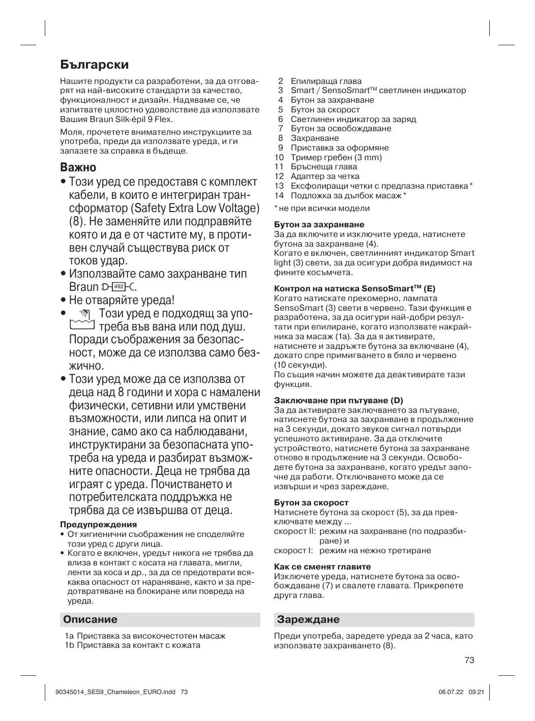 Български Нашите продукти са разработени, за да отговарят на най-високите стандарти за качество, функционалност и дизайн. Надяваме се, че изпитвате цялостно удоволствие да използвате Вашия Braun Silk·épil 9 Flex. Моля, прочетете внимателно инструкциите за употреба, преди да използвате уреда, и ги запазете за справка в бъдеще.