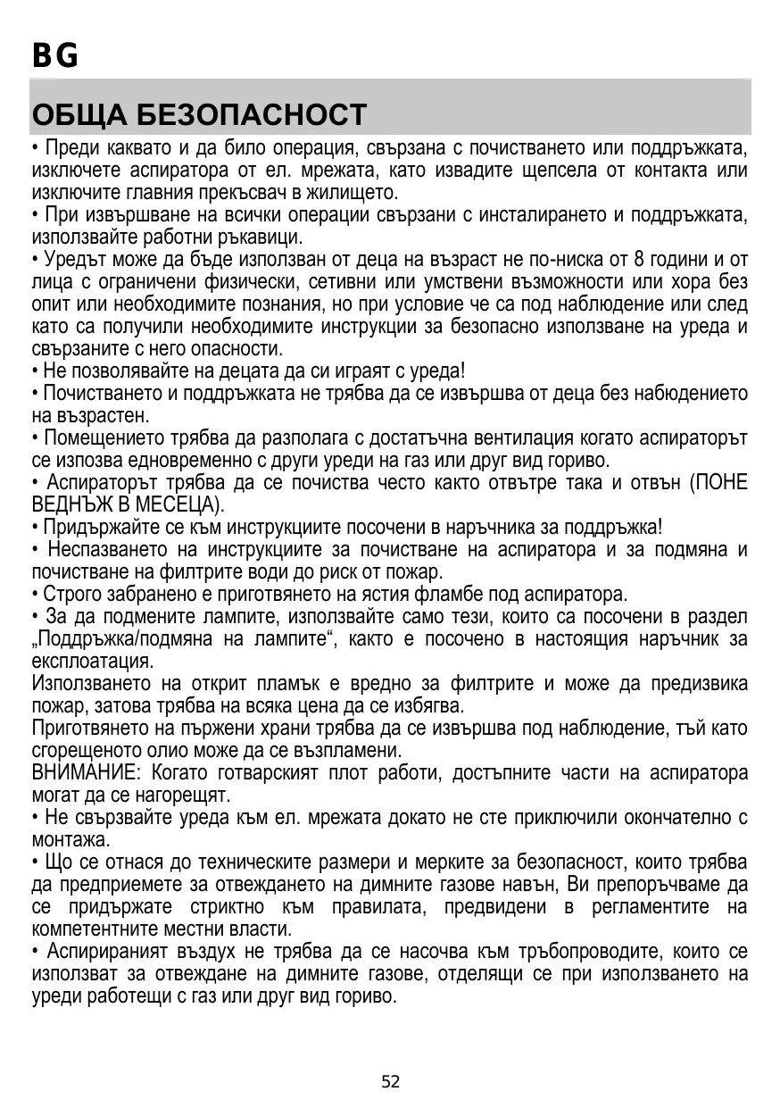 BG ОБЩА БЕЗОПАСНОСТ • Преди каквато и да било операция, свързана с почистването или поддръжката, изключете аспиратора от ел. мрежата, като извадите щепсела от контакта или изключите главния прекъсвач в жилището. • При извършване на всички операции свързани с инсталирането и поддръжката, използвайте работни ръкавици. • Уредът може да бъде използван от деца на възраст не по-ниска от 8 години и от лица с ограничени физически, сетивни или умствени възможности или хора без опит или необходимите познания, но при условие че са под наблюдение или след като са получили необходимите инструкции за безопасно използване на уреда и свързаните с него опасности. • Не позволявайте на децата да си играят с уреда! • Почистването и поддръжката не трябва да се извършва от деца без набюдението на възрастен. • Помещението трябва да разполага с достатъчна вентилация когато аспираторът се изпозва едновременно с други уреди на газ или друг вид гориво. • Аспираторът трябва да се почиства често както отвътре така и отвън (ПОНЕ ВЕДНЪЖ В МЕСЕЦА). • Придържайте се към инструкциите посочени в наръчника за поддръжка! • Неспазването на инструкциите за почистване на аспиратора и за подмяна и почистване на филтрите води до риск от пожар. • Строго забранено е приготвянето на ястия фламбе под аспиратора. • За да подмените лампите, използвайте само тези, които са посочени в раздел „Поддръжка/подмяна на лампите“, както е посочено в настоящия наръчник за експлоатация. Използването на открит пламък е вредно за филтрите и може да предизвика пожар, затова трябва на всяка цена да се избягва. Приготвянето на пържени храни трябва да се извършва под наблюдение, тъй като сгорещеното олио може да се възпламени. ВНИМАНИЕ: Когато готварският плот работи, достъпните части на аспиратора могат да се нагорещят. • Не свързвайте уреда към ел. мрежата докато не сте приключили окончателно с монтажа. • Що се отнася до техническите размери и мерките за безопасност, които трябва да предприемете за отвеждането на димните газове навън, Ви препоръчваме да се придържате стриктно към правилата, предвидени в регламентите на компетентните местни власти. • Аспирираният въздух не трябва да се насочва към тръбопроводите, които се използват за отвеждане на димните газове, отделящи се при използването на уреди работещи с газ или друг вид гориво.