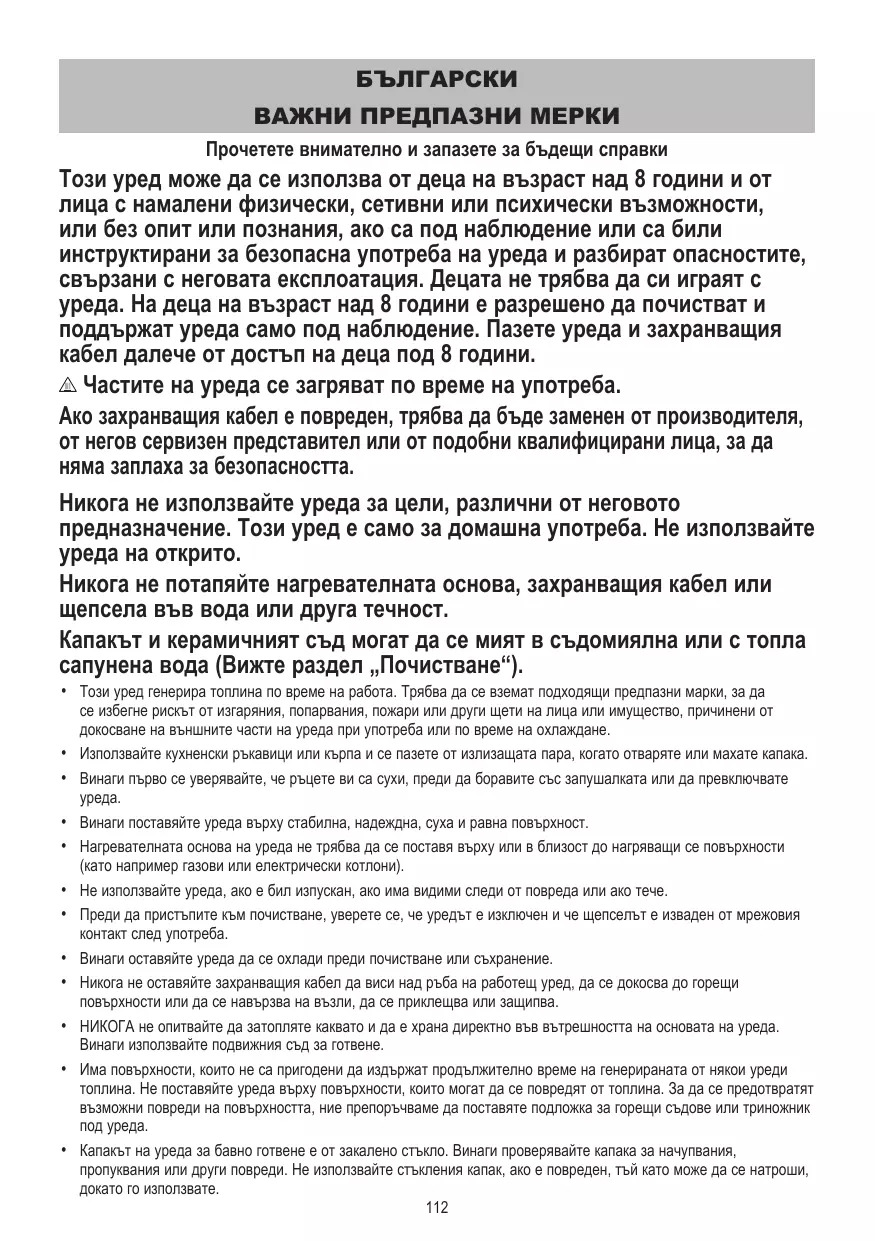 Този уред може да се използва от деца на възраст над 8 години и от лица с намалени физически, сетивни или психически възможности, или без опит или познания, ако са под наблюдение или са били инструктирани за безопасна употреба на уреда и разбират опасностите, свързани с неговата експлоатация. Децата не трябва да си играят с уреда. На деца на възраст над 8 години е разрешено да почистват и поддържат уреда само под наблюдение. Пазете уреда и захранващия кабел далече от достъп на деца под 8 години. Частите на уреда се загряват по време на употреба. Ако захранващия кабел е повреден, трябва да бъде заменен от производителя, от негов сервизен представител или от подобни квалифицирани лица, за да няма заплаха за безопасността. Никога не използвайте уреда за цели, различни от неговото предназначение. Този уред е само за домашна употреба. Не използвайте уреда на открито. Никога не потапяйте нагревателната основа, захранващия кабел или щепсела във вода или друга течност. Капакът и керамичният съд могат да се мият в съдомиялна или с топла сапунена вода (Вижте раздел „Почистване“). • Този уред генерира топлина по време на работа. Трябва да се вземат подходящи предпазни марки, за да • • • • • • • • • •