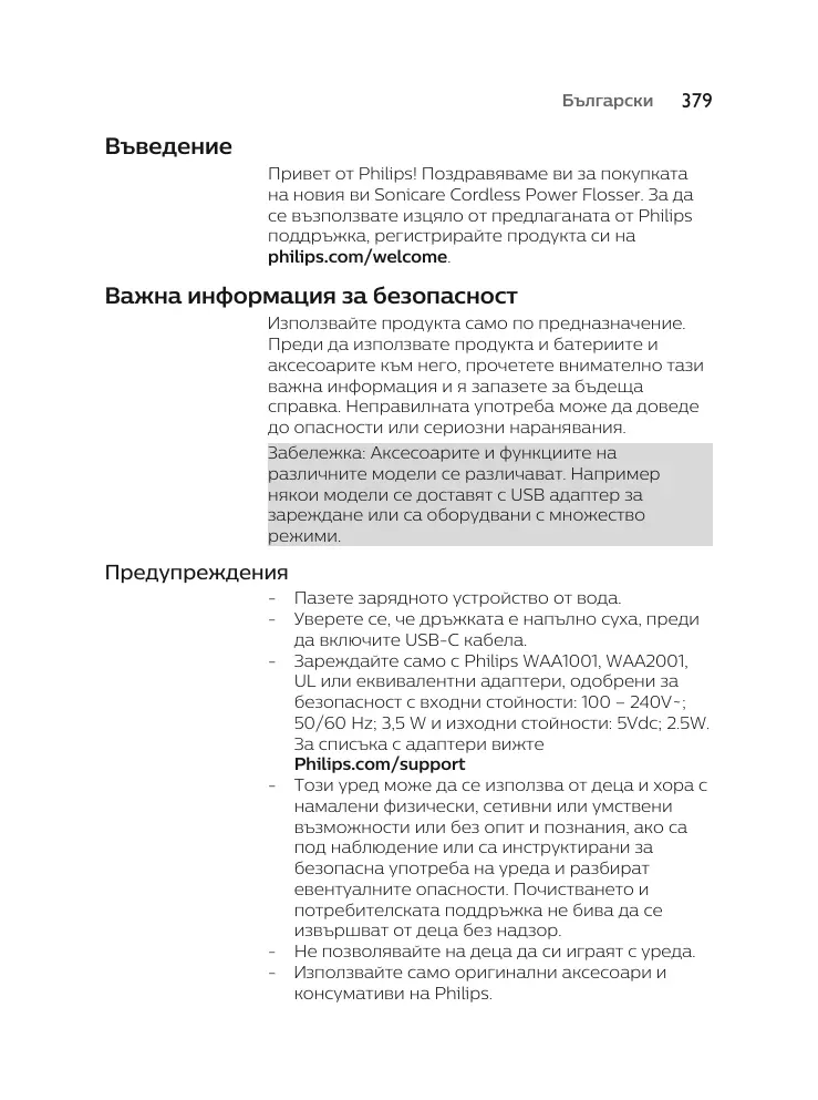 Пазете зарядното устройство от вода. Уверете се, че дръжката е напълно суха, преди да включите USB-C кабела. Зареждайте само с Philips WAA1001, WAA2001, UL или еквивалентни адаптери, одобрени за безопасност с входни стойности: 100 – 240V~; 50/60 Hz; 3,5 W и изходни стойности: 5Vdc; 2.5W. За списъка с адаптери вижте Philips.com/support Този уред може да се използва от деца и хора с намалени физически, сетивни или умствени възможности или без опит и познания, ако са под наблюдение или са инструктирани за безопасна употреба на уреда и разбират евентуалните опасности. Почистването и потребителската поддръжка не бива да се извършват от деца без надзор. Не позволявайте на деца да си играят с уреда. Използвайте само оригинални аксесоари и консумативи на Philips.