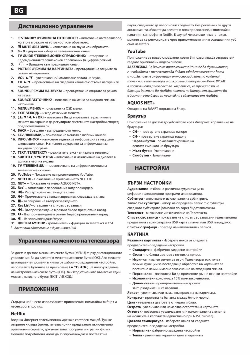Съдържа най-често използваните приложения, помагайки за бърз и лесен достъп до тях. Netflix Водеща Интернет телевизионна мрежа в световен мащаб. Тук ще откриете хиляди филми, телевизионни предавания, включително оригинални сериали, документални програми и игрални филми. Нейните потребители могат да възпроизвеждат и поставят на пауза, след което да възобновят гледането, без реклами или други ангажименти. Можете да влезете в това приложение, използвайки наличния си профил в Netflix. В случай че все още нямате такъв, можете да се регистрирате чрез приложението или в официалния уеб сайт на Netflix. YouTube Приложение за видео споделяне, което Ви позволява да откривате и гледате оригинални видеоклипове. ЗАБЕЛЕЖКА: За да може приложението Youtube да функционира, е необходимо в телевизора да бъдат зададени точните дата и час. За повече информация относно задаването на дата/ точен час в телевизора, моля разгледайте раздел Меню ВРЕМЕ в настоящото ръководство. Уверете се, че мрежата Ви не блокира достъпа до YouTube, както и че Интернет връзката Ви е достатъчно бърза за преглед на съдържание от YouTube. AQUOS NET+ Отваряне на SMART-портала на Sharp.