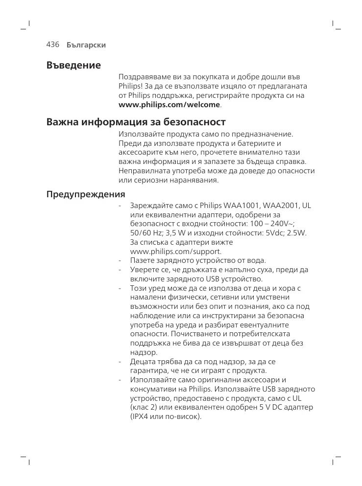- Utilisez exclusivement des accessoires ou des consommables de la marque Philips. Utilisez uniquement le chargeur USB fourni avec le produit avec un adaptateur SV CC (IPX4 ou supérieur) homologué UL (classe 2) ou équivalent.