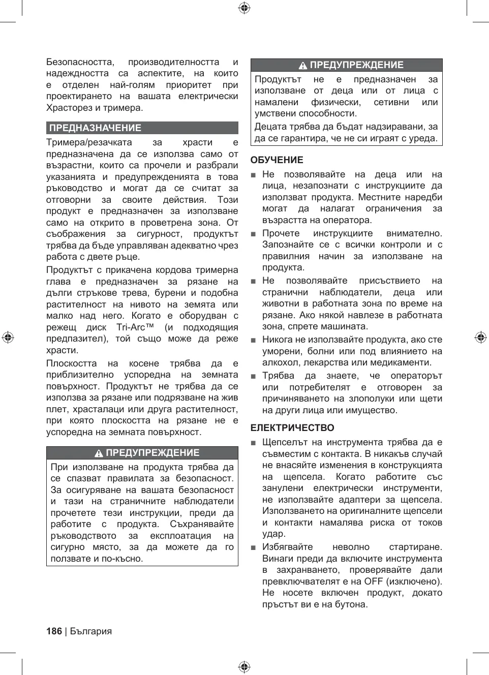 UTILISATION PRÉVUE La coupe-bordures et débrousailleuse électrique doit être utilisée seulement par des adultes ayant lu et compris les instructions et les avertissements inclus dans le présent manuel et pouvant être considérés comme responsables de leurs actes. Ce produit ne doit être utilisé qu'à l'extérieur dans une zone bien ventilée. Pour des raisons de sécurité, l'appareil doit être manipulé de manière appropriée, en utilisant les deux mains.