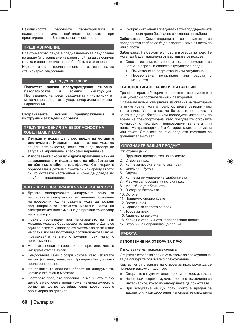 Remarque: ne mettez pas vos doigts dans la sortie de poussière. Vous pourriez vous blesser les doigts avec les lames en rotation. = Arrêtez l'appareil, assurez-vous de l'arrêt complet de la lame et retirez le bloc de batterie avant de: + Nettoyer un blocage ou déboucher + Vérifier, nettoyer ou travailler sur le produit