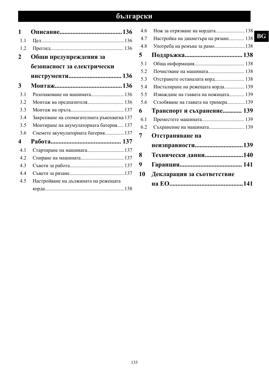 Dépannage... Données techniques .… Garantie. Déclaration de conformité CE... te machine sert à couper l'herbe, les petites broussailles et proximité du niveau du sol. Le
