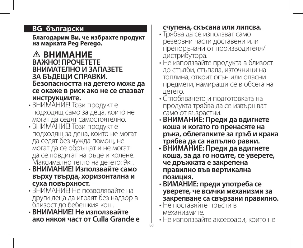 Téléchargez la notice de votre Бебешки колички и аксесоари au format PDF gratuitement ! Retrouvez votre notice Culla Grande - PEG PEREGO et reprennez votre appareil électronique en main. Sur cette page sont publiés tous les documents nécessaires à l'utilisation de votre appareil Culla Grande de la marque PEG PEREGO.